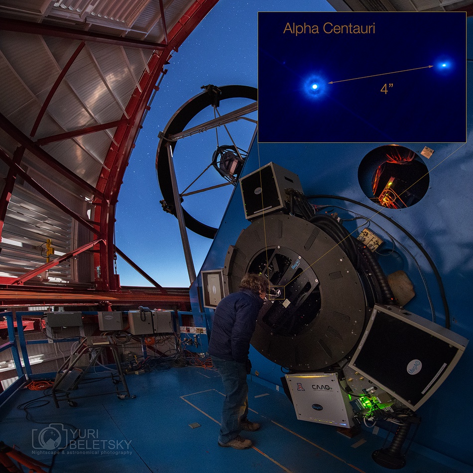 Однако, на сегодняшней фотографии изображён наземный телескоп и кадр, полученный на Земле. Новая система активной адаптивной оптики MagAO может убрать атмосферное размытие при визуальном наблюдении звёзд, например, знаменитой двойной системы α Центавра. На фотографии видно, как астроном Лард Клоус тестирует глазом 6.5-метровый Магелланов телескоп Клея, расположенный в обсерватории Лас-Кампанас. Учёный наслаждается легендарным дифракционным изображением (на вставке) и хорошим угловым разрешением близкой двойной системы с Земли, а не с околоземной орбиты.