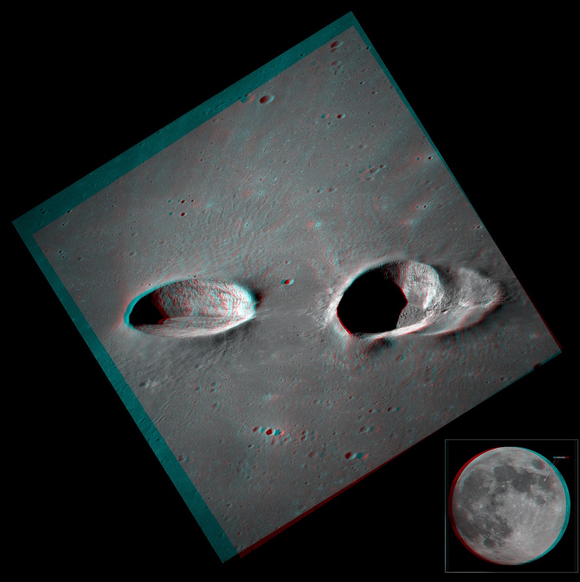 Многие яркие туманности и звездные скопления на небе планеты Земля связаны с именем астронома Шарля Мессье, так как они были включены в его знаменитый каталог, составленный в 18-м веке. Его именем названы и эти два больших и замечательных кратера на Луне. Кратеры Мессье (слева) и Мессье А хорошо выделяются на темной, ровной поверхности лунного моря Изобилия, их размеры, соответственно – 15х8 и 16х11 километров. Вытянутая форма кратеров объясняется тем, что тело, при падении которого они образовались, летело слева направо под небольшим углом к поверхности. Такая траектория падения также привела к появлению двух светлых лучей из выброшенного вещества, которые протянулись направо, за границами картинки. Эта замечательная стереофотография пары кратеров, которую нужно рассматривать в красно/голубых очках (красное стекло перед левым глазом), была недавно создана после сканирования с высоким разрешением двух изображений (AS11-42-6304 и AS11-42-6305), полученных во время полета на Луну корабля Аполлон-11