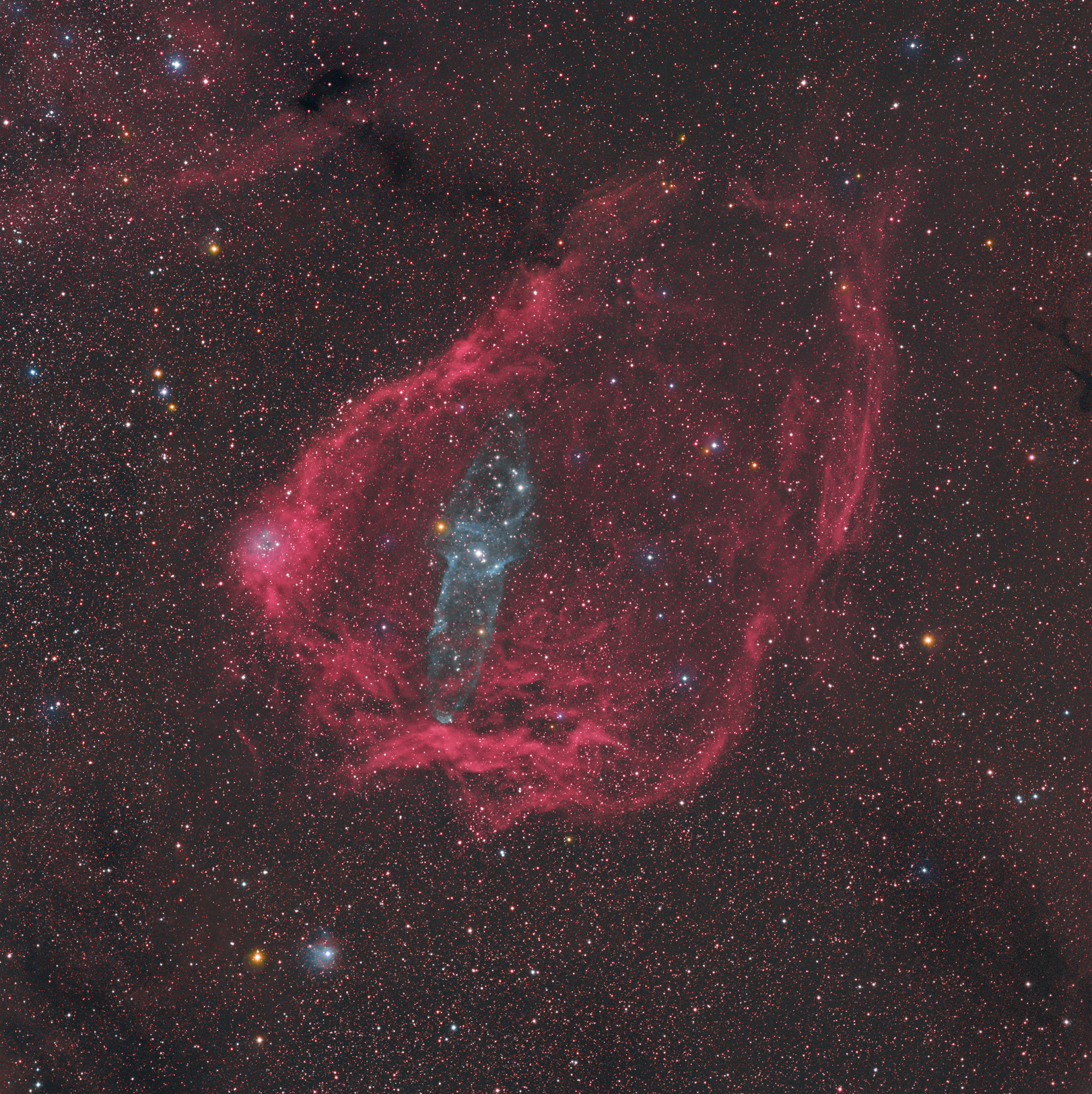 Две удивительные туманности, занимающие на небе область в 4 градуса (или 8 угловых диаметров Луны) находятся в созвездии Цефея на расстоянии около 2 300 световых лет от нас. Это туманность Гигантский Кальмар (или Ou4) и туманность Летучая мышь (или Sh2-129). Изображение получено сложением широкополосных и узкополосных снимков с сумарной выдержкой более 20 часов.