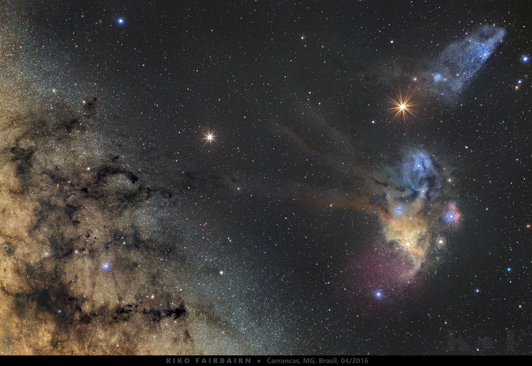 На этой замечательной фотографии есть всё: планеты, звёзды, туманности, Млечный Путь. Ближе всего к нам расположились две планеты: Марс (справа) и Сатурн (в центре), видимые как две ярчайшие звезды с лучами в верхней части кадра. Ниже Марса видны живописные звёздные облака ρ Змееносца с яркой оранжевой звездой Антарес. В межзвёздных облаках смешались и красноватые излучательные туманности, и голубые отражательные. В правом верхнем углу видна отражательная туманность Голубая конская голова. В нижнем левом углу заметны многочисленные темные туманности на фоне Млечного Пути. Эта мозаика составлена из нескольких кадров, сделанных в прошлом месяце в Бразилии. И хотя для того, чтобы увидеть эти туманности, вам понадобится телескоп, Сатурн и Марс будут видны невооружённым глазом в течение большей части ночи.