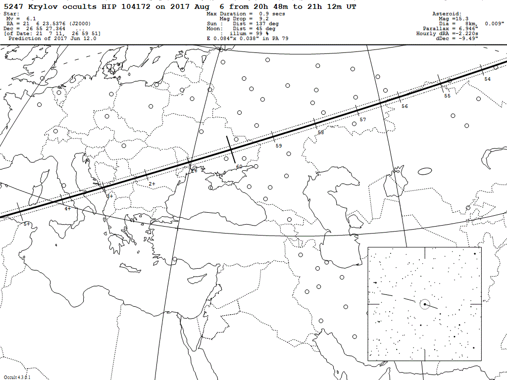 Добавлю еще одно весьма интересное событие, которое произойдет в ночь с 6 на 7 августа практически точно в полночь. Это покрытие астероидом 5247 Крылов звезды HIP 104172 из созвездия Лисички, блеск которой 6,1m! Полоса покрытия будет проходить через юго-восток Украины. Правда, диаметр астероида всего около 8 км. Соответственно и ширина покрытия будет небольшой, как и время покрытия - 0,9 секунды.  Просмотров: 2131