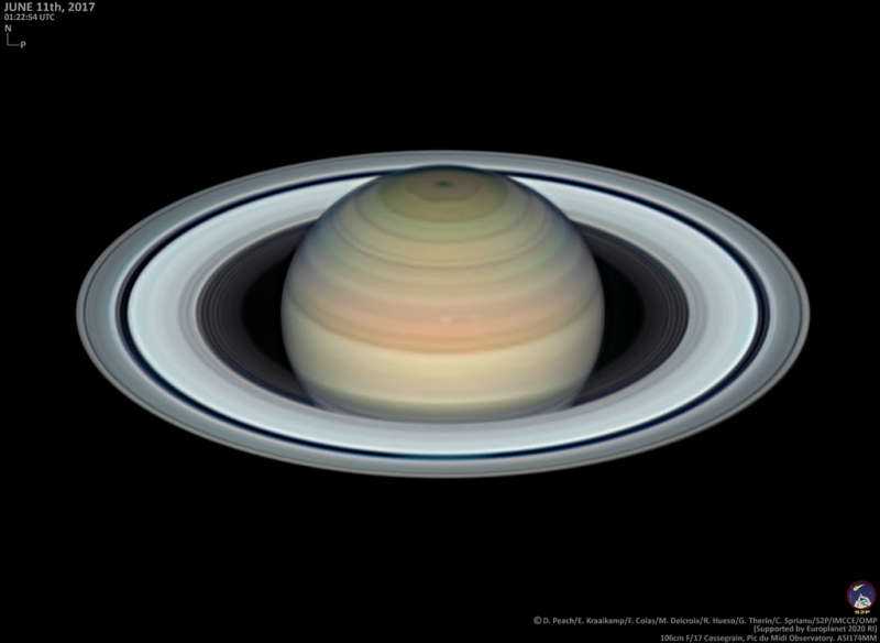 Сатурн достиг противостояния 16 июня 2017 года. Противостояние означает, что планета находится в противоположной Солнцу точке на небе Земли. Около противостояния Сатурн виден всю ночь, он ближе всего к Земле и достигает наибольшей яркости за весь год. Это удивительно четкое изображение окруженной кольцами планеты было получено несколько дней назад, 11 июня, на 1-метровом телескопе расположенной на вершине горы обсерватории Пик дю Миди. На снимке север вверху, хорошо видны освещенные Солнцем северный полярный ураган и странный шестиугольник на гигантской планете. Замечательная система колец также показана очень подробно. Узкая щель Энке видна вокруг всего внешнего кольца А, маленькие колечки можно увидеть внутри слабого внутреннего кольца С, а южное полушарие просвечивает через широкое деление Кассини. Около противостояния кольца Сатурна выглядят исключительно яркими, это явление известно как эффект противостояния или эффект Зеелигера. Когда кольца видны с Земли освещенными прямыми лучами Солнца, ледяные частицы колец не отбрасывают тени, и сильное обратное рассеяние приводит к значительному увеличению яркости. Все же лучшие виды окруженной кольцами планеты сейчас открываются с обращающегося вокруг Сатурна космического аппарата Кассини. В настоящее время он находится на финальной орбите номер 9, позволяющей приближаться к планете Авторы и права: Д.Пич