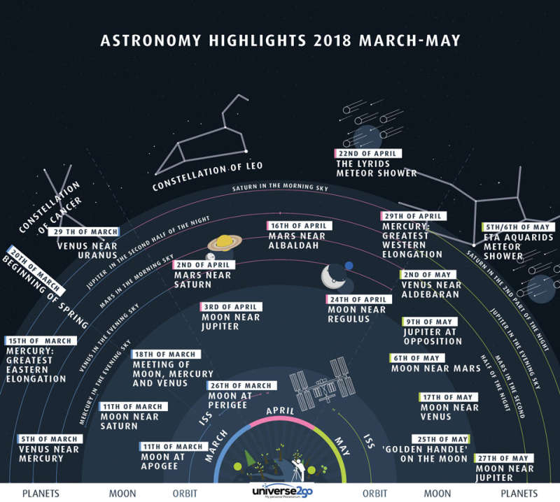 Что произойдет на небе этой весной? На картинке показаны некоторые астрономические явления для северного полушария Земли. Картинка похожа на циферблат с центром внизу, причем события, которые произойдут в начале весны, отмечены слева, а ожидаемые в конце весны – справа. Объекты, сравнительно близкие к Земле, показаны ближе к фигурке человека с телескопом около середины нижнего края картинки. Однако почти все изображенные явления можно будет увидеть без телескопа. Основные события этой весны – яркая Венера на вечернем небе в марте, метеорный поток Лириды в апреле и появление Юпитера на вечернем небе в мае. Как и в другие времена года, Международную космическую станцию (МКС) можно будет иногда увидеть движущейся по небу, если знать, когда и куда смотреть. Авторы и права: Universe2go.com