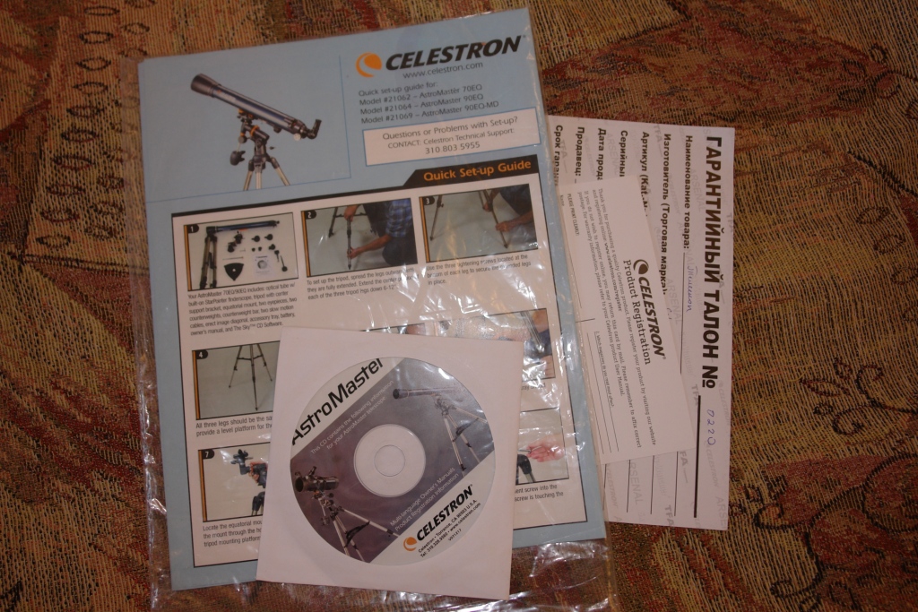 Продаю Телескоп Celestron AstroMaster 90 EQ Телескоп в идеальном состоянии, есть лишь маленькая поверхностная царапина на корпусе. Был куплен в 2011-ом году, использовался мало и бережно. Имеется полный комплект, включая коробку, аксессуары, инструкцию на английском и на русском языке, софт на диске, документы о покупке. Характеристики: Рефрактор ахромат Диаметр объектива 90 мм Фокусное расстояние объектива 1000 мм Полезное увеличение 13x-213x Звездная величина 12.3 Искатель: Встроенный StarPointer Экваториальная монтировка CG-3 (с механизмами тонких движений и координатными кругами), крепление «ласточкин хвост» Стальной трубчатый штатив с полочкой для аксессуаров Окуляры и увеличения: 20 мм (50x), 1,25"; 10 мм (100x), 1,25", призма / зеркало: оборачивающая призма 90°, 1,25", программное обеспечение: The Sky Level I, разрешение: критерий Рэлея 1,54"; предел Дауэса 1,29". Дополнительно продаю также линзу Барлоу (входит в общую стоимость). Цена 5300 грн.