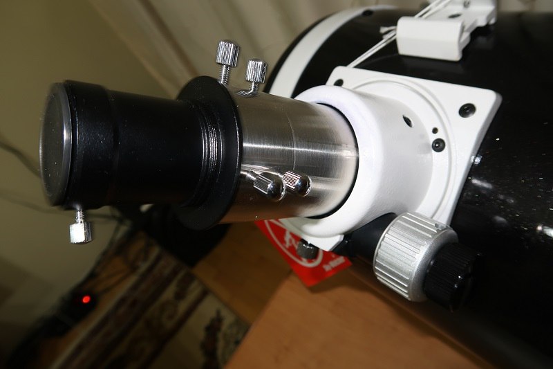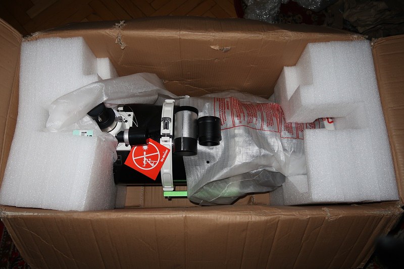 Телескоп в повному заводському комплекті у використанні небагато. Були зроблені деякі доробки людиною з нашого форуму astrokor такі як: -заміна второпластикого прижима на осі фокусера на металевий прижим +досталені 4-ри додаткових підшипника. -заміна дефолтної трубки фокусера на подовжену нержавійну з додатковими 2-ма зажимами(щоб піходили різні коректори коми такі як Explore Scientific HR 2 coma corrector,TeleVue Paracorr 1)які потребують більшого виносу трубки фокусера. -поміняні юстировочні болти діагонального зеркала для зручності юстування.