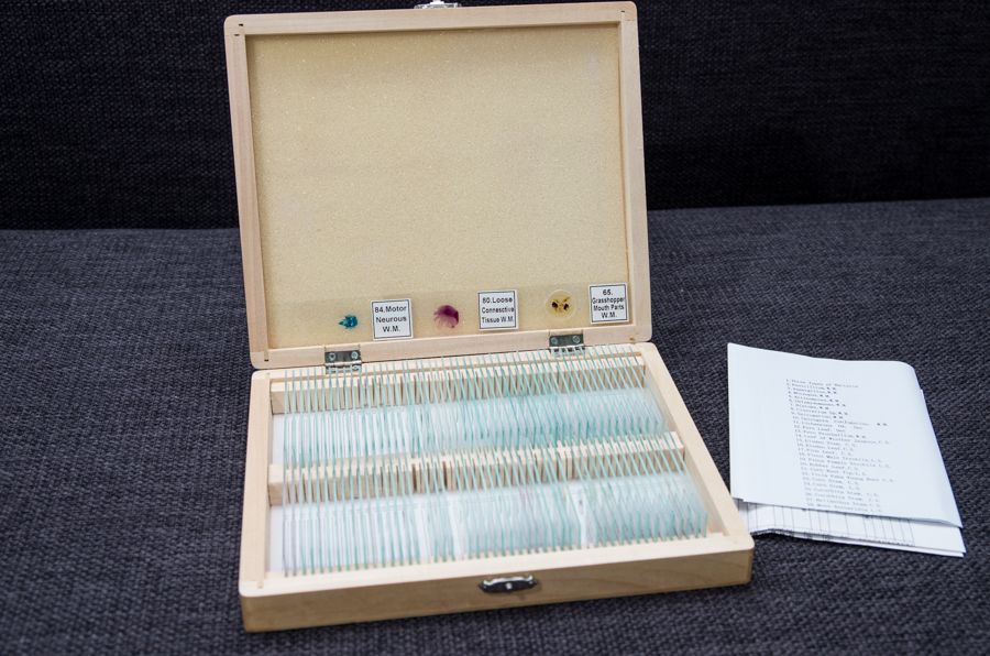 Все препараты разные. Бактерии, грибы, одноклеточные, срезы растений и тканей животных, насекомые. Набор препаратов для изучения, включающий элементы растительного и животного происхождения.