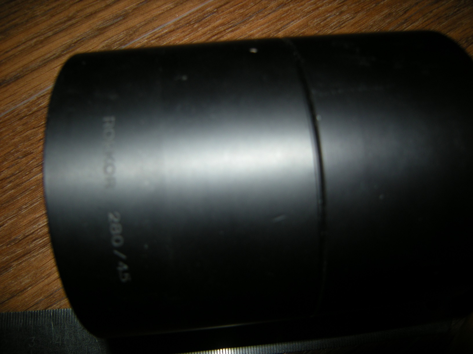 Что касается характеристик - то на первом фото видно 280/4.5. Это означает что фокус 280мм, светосила 4.5, т.е. диаметр 62мм.