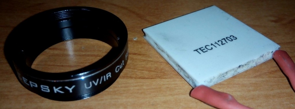в комплекте: объектив 150 °, адаптер 2 "/ 1,25" и. M42X0.75, кабель 2м(запасной для камеры и usb удлинитель),штатный IR фильтр заменён на фильтр DeepSky UV-IR cut 1.25"(установлен непосредственно над матрицей), изнутри корпус обклэен теплоизоляцией(для исключения образования росы).в пустоту между датчиком и корпусом через термо прокладки установлен серебряный брусочек(для лучшей теплоотдачи).в комплект добавил оправу от фильтра и элемент Пельтье:ТЕС-112703(30х30)мм,3.2А,12V(с его помощью удавалось снизить температуру на 10 градусов)