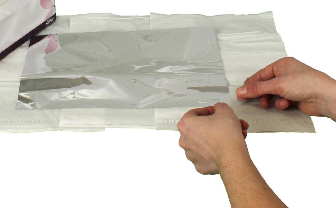 Расстелем на ровной поверхности стола пару салфеток или чистую ткань, и закрепим их по углам кусочками липкой ленты или скотча. Поверхность ткани должна быть ровная, без каких-либо морщин.
