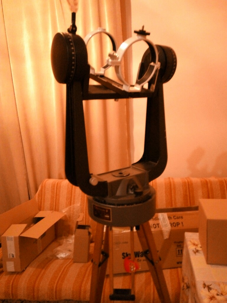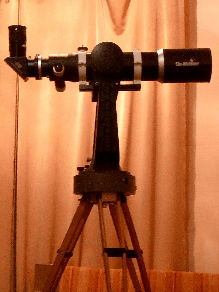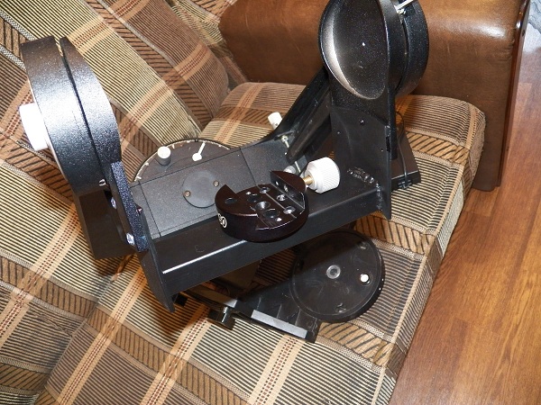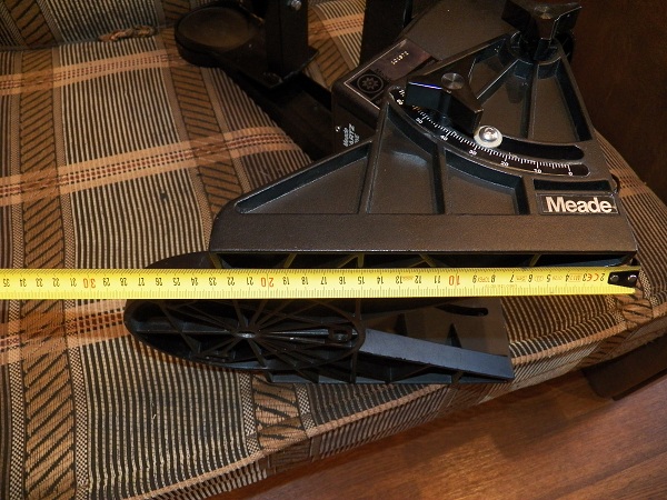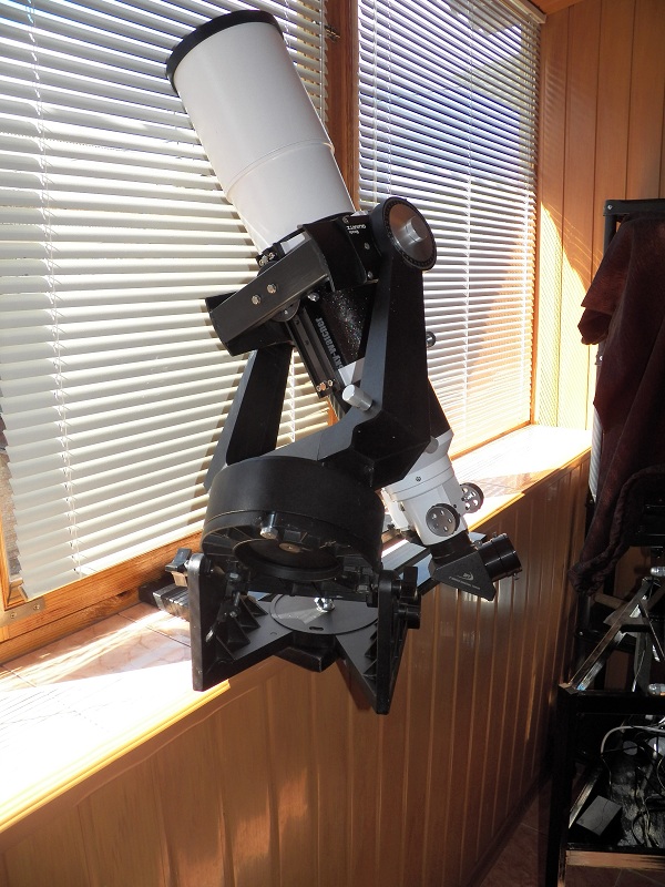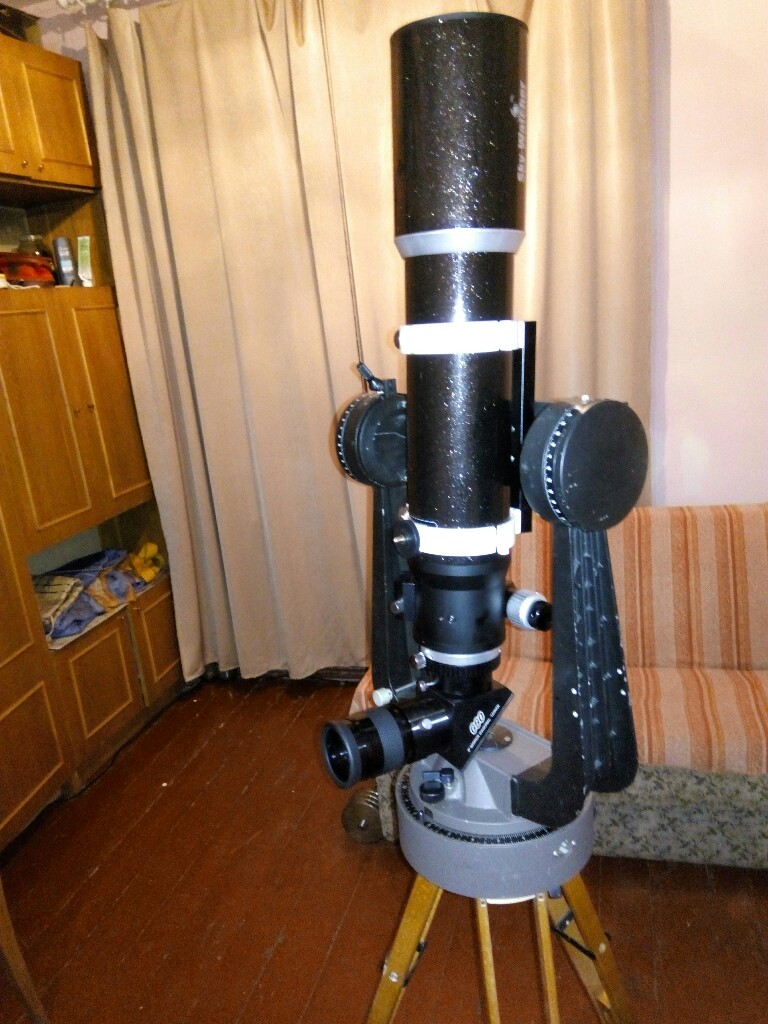 В продолжение моды... Для рефрактора 102/600 приобрел у Давида вилку от Celestron 8 ST вместе с переходником, Давид сделал на нем два отверствия под планку ЛХ и шайбу для крепления вилки на штатив. У вилки есть винты тонких движений и регуляторы плавности хода. Можно включить вращение, но только вокруг вертикальной оси, нету клина. Весят вилка и штатив около 7 кг, но выношу их из домика на несколько десятков метров. Наблюдения удобны, оперативно навожусь на объекты, только надо постоянно отпускать и фиксировать трубу, но даже так намного лучше, чем мучения на AZ3. Труба с диагональным зеркалом и выдвинутым фокусером достает в зенит, но будь она чуть длинее, уже не смогла бы. Для обеих осей есть круги с градусной шкалой, можно через сетку Stellarium по опорным звездам найти рядом нужны объекты. Спасибо Давиду, что развеял мои первоначальные сомнения и подготовил бюджетный, но, как оказалось, комфортный сетап.