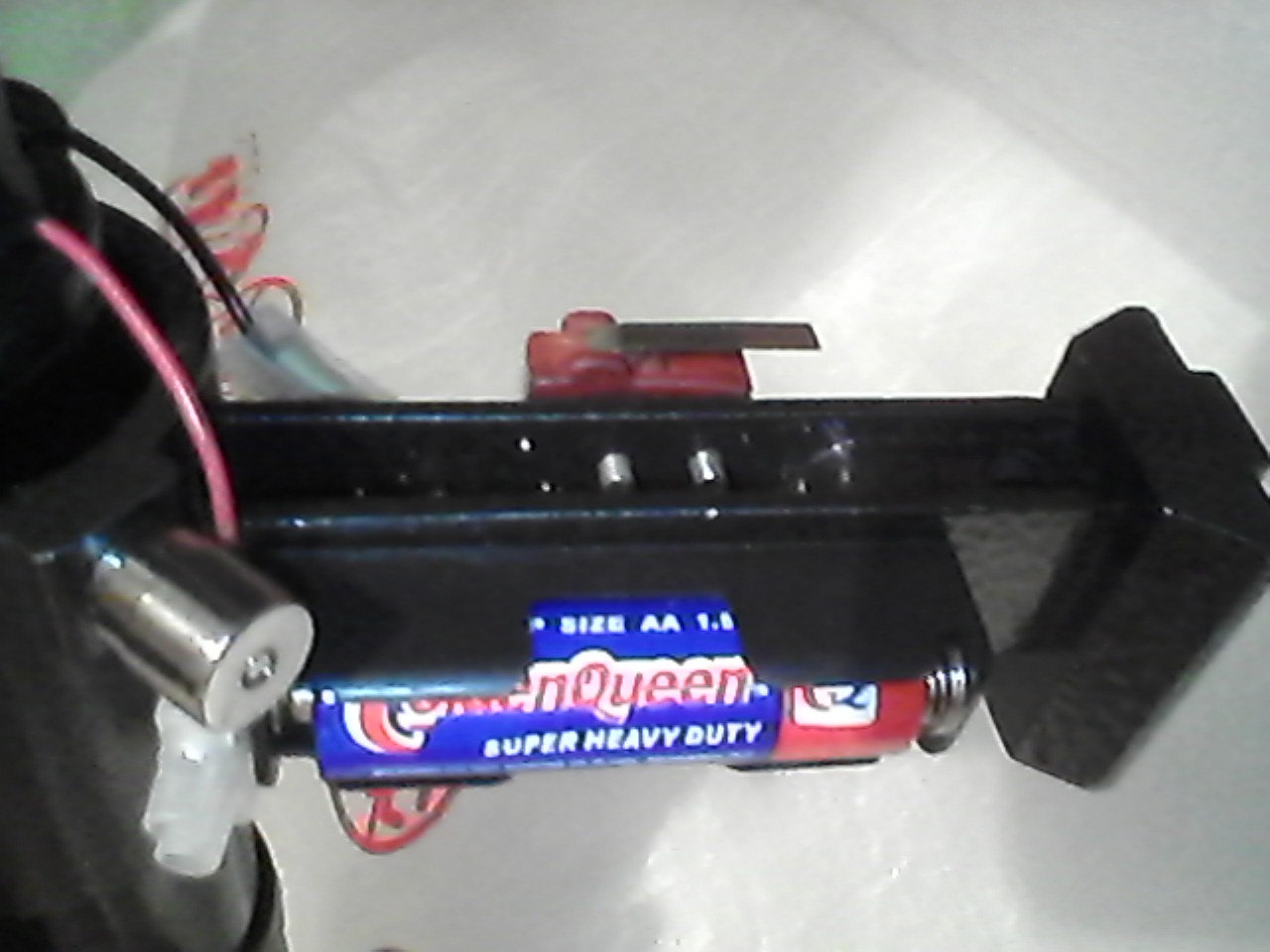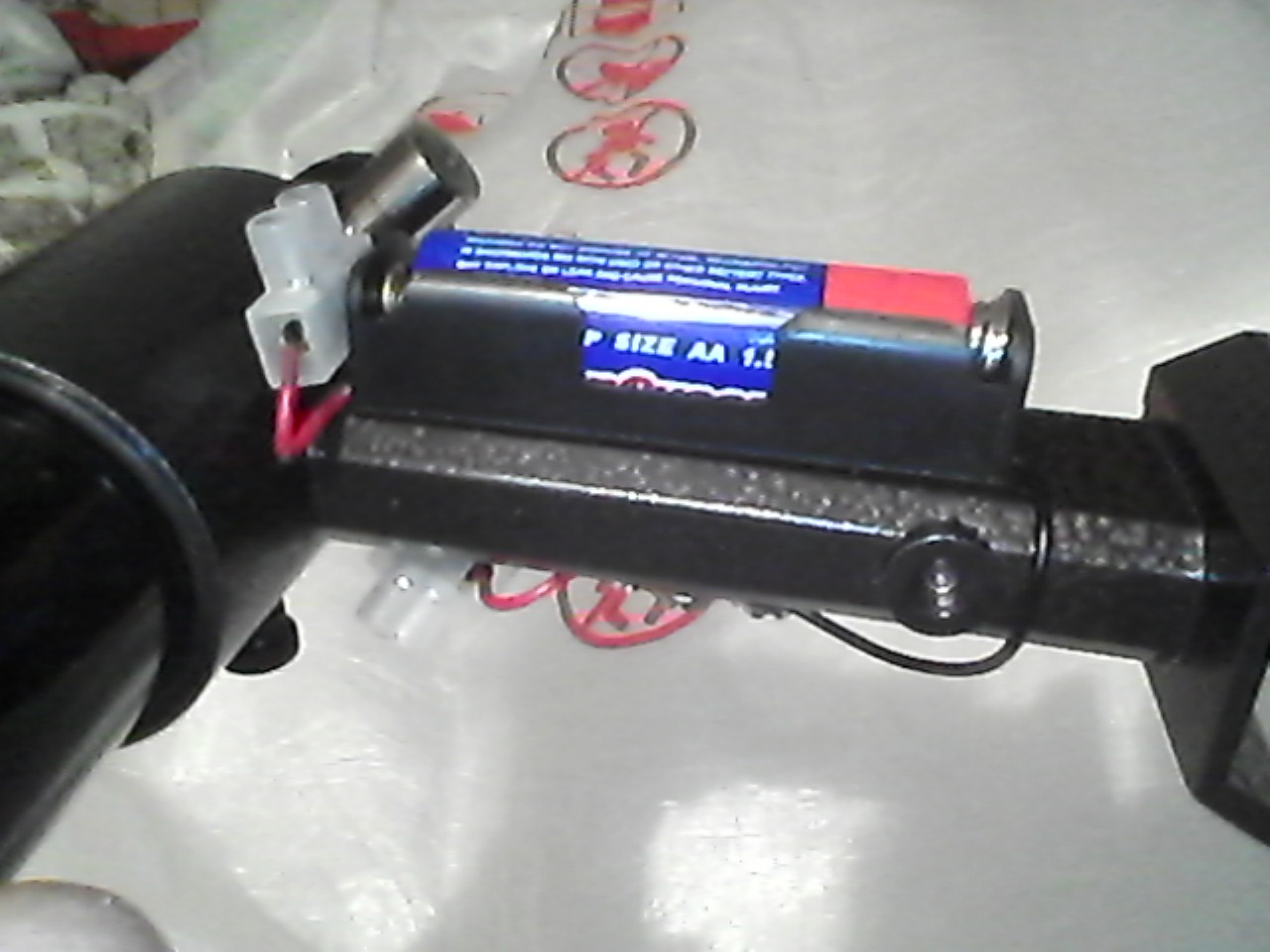 Еще раз спасибо Вадиму за идею!Долго не тянул,пару вечеров,все готово,пару потому,что пришлось сбегать в радиомагазин.В продаже есть боксы открытого типа под 1 батарейку,удобно вынимать не разбирая,сидит батарейка плотно, прижата хорошо,и добавил микроперелючатель с нефиксированными контактами,включил,есть подсветка,настроил,отпустил контакт,подсветки нет,светодиод АЛ сотой серии под 1.5 В,крепеж выключателя и бокса -пришлось сделать резьбу М3,на прочность кронштейна искателя не повлияла