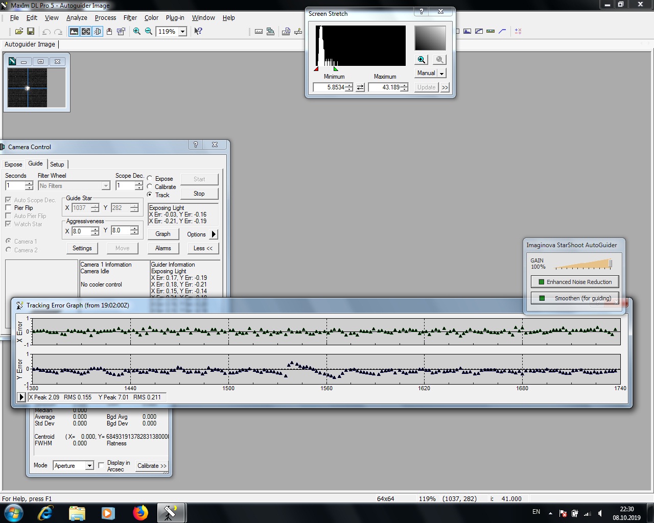 А так же скрин экрана компьютера. Гидирующей программой выступал Maxim DL5. Собственно на скрине можно оценить график гидирования.  Просмотров: 4739