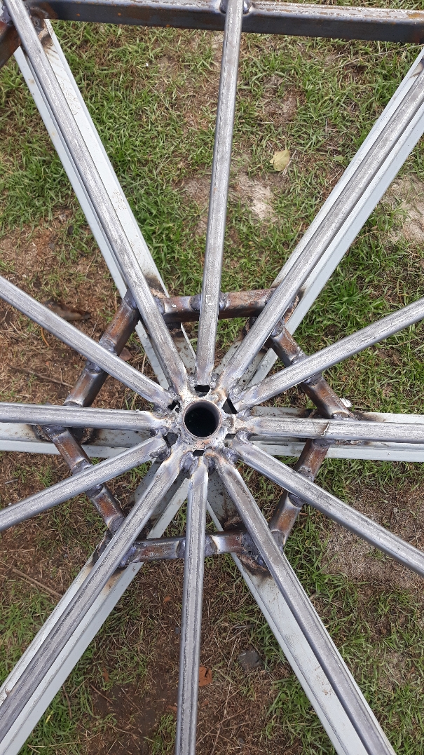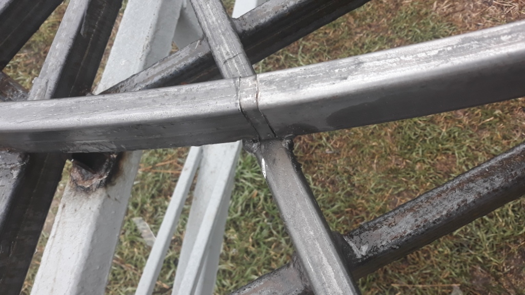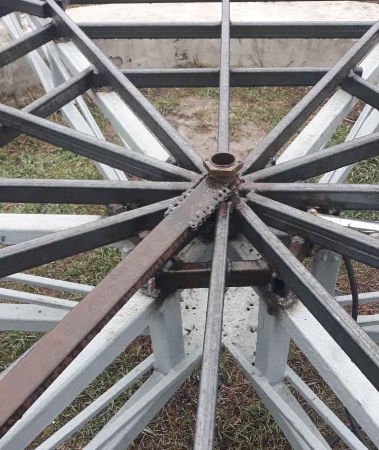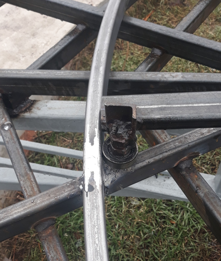 Третього ранку завершив роботу. Як тільки встановиться суха погода - вкрию грунтовкою. Взагалі задоволений пезультатом. Конструкція стала набагато жорсткіша. Підшипник "циркуля" в деяких місцях рухається трішки туго, у інших- ледь торкається стінки, але ніде не відривається від труби і ніде не клинить. Думаю погрішність становить 3-5 мм. Або максимум 5-7 - до 1 см при данній температурі. Це повинно задовольнити вимги по точності.