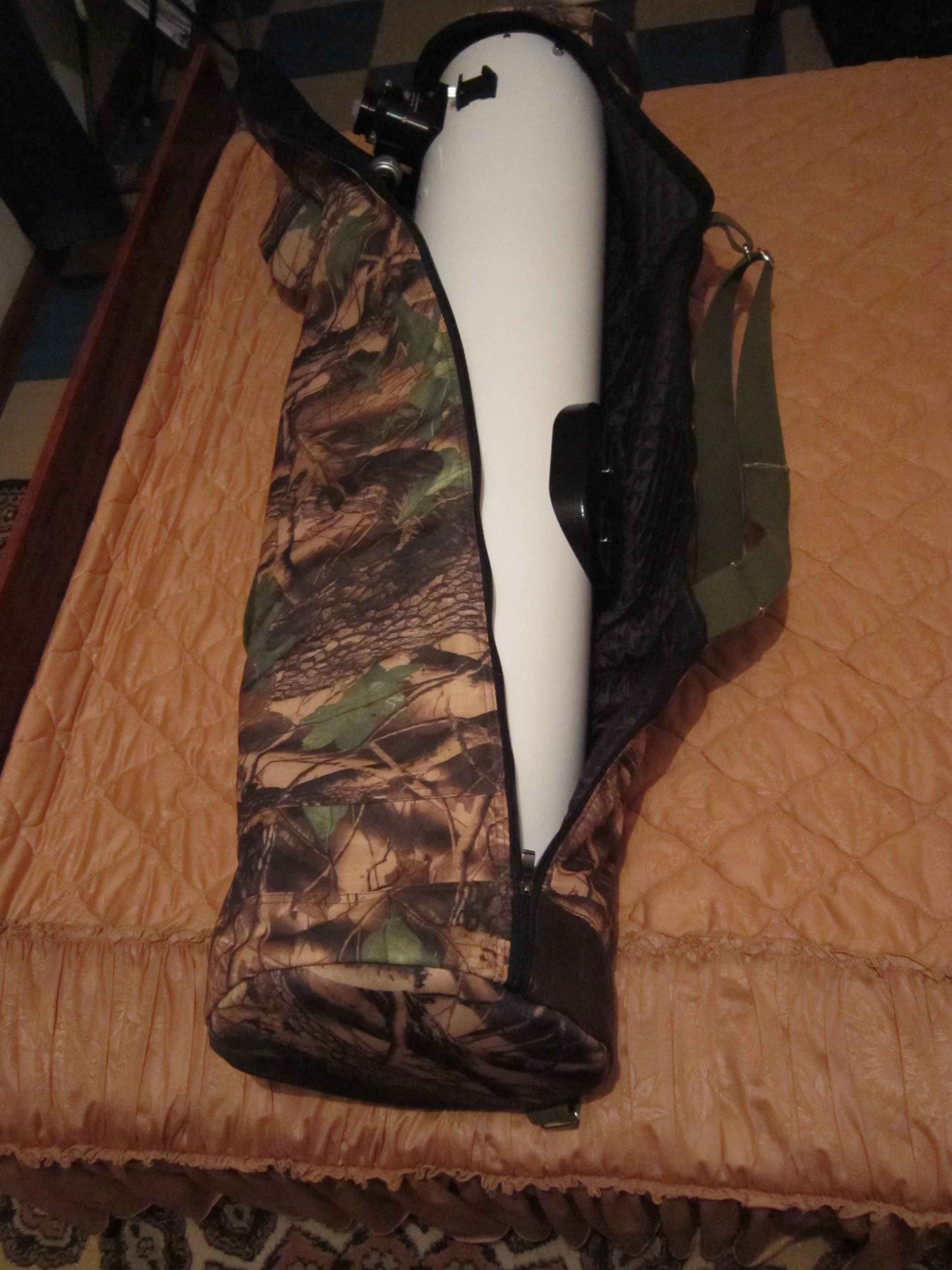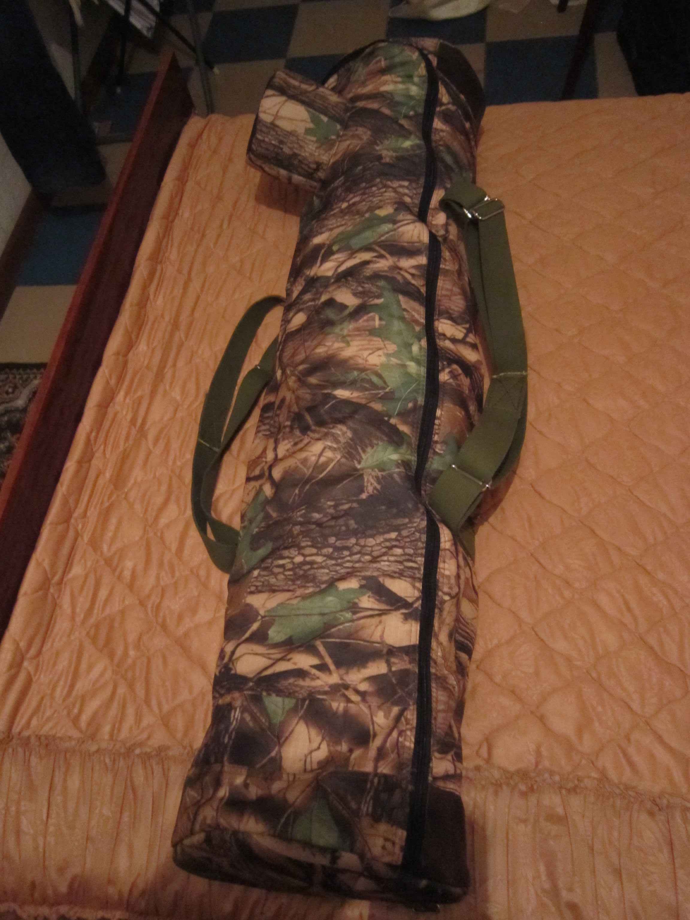 Доброго времени суток. После приобретения скопа Доб8 от ГСО стал остро вопрос о сумке для трубы. В наличии в магазине есть сумки для добов от скайвотчер, но они меньше по размерам. После поиска по инету готового решения решил пошить чехол в ателье. Результат работы можно оценить на фото. По деньгам вышло 660 грн (материал + работа). Материал - палаточная ткань с пропиткой (типа клеенки с другого края, подкладка и между ними синтипон 10 мм. Ручки - брезент 45 мм шириной. Самое прочное что нашел.