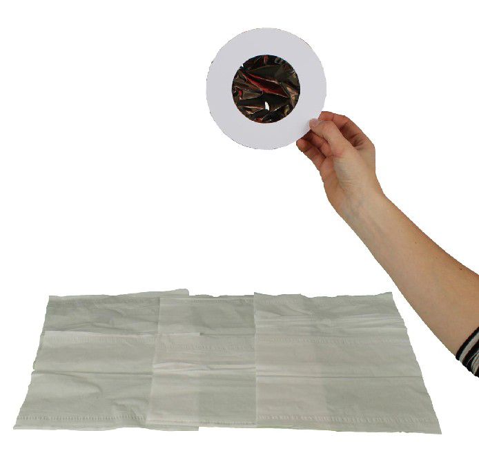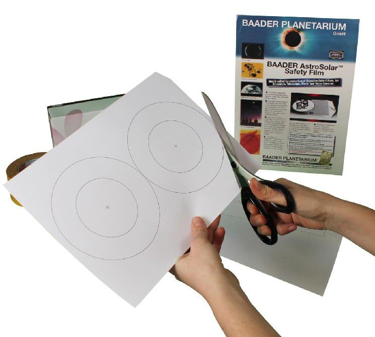 Вырежем необходимый по размерам квадратный кусок пленки AstroSolar. При резке AstroSolar всегда держите пленку между двумя чистыми листами бумаги, чтобы не оставить отпечатки пальцев на рабочем слое. Самые новые партии пленки поставляется уже с защитным слоем с обеих сторон.