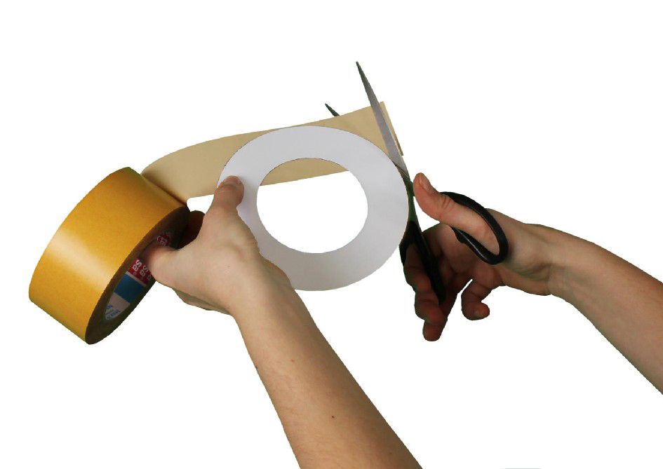 Одну сторону каждого картонного кольца заклеим двухсторонним скотчем. Излишки скотча внутри и с наружи колец аккуратно обрежем.  Просмотров: 220803
