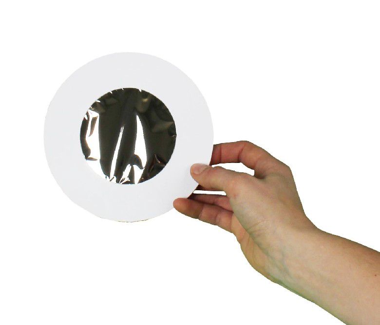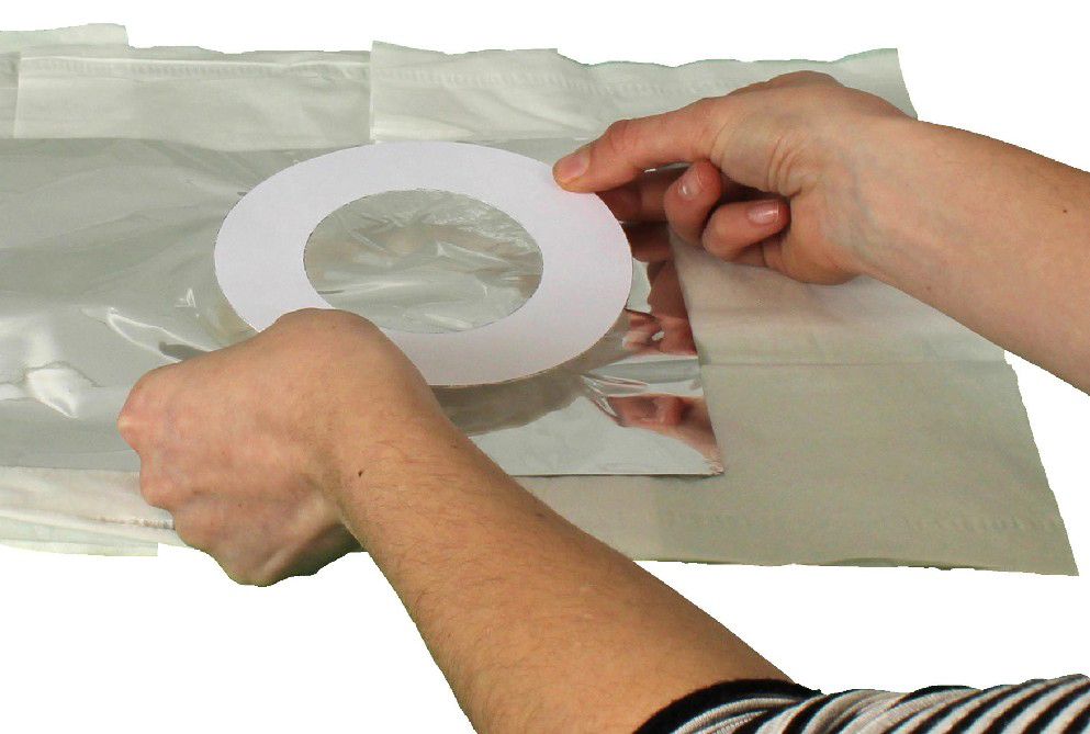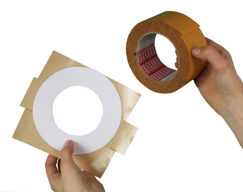 Возьмем одно из картонных колец и снимем защитный слой с двухстороннего скотча. Затем, липкой стороной вниз, с высоты примерно один сантиметр, дадим кольцу упасть на пленку AstroSolar, так чтобы кольцо коснулось и прилипло к пленке по всей площади одновременно.  Просмотров: 220802
