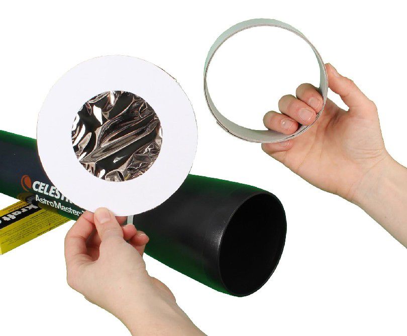 Теперь возьмем полоску картона шириной не менее 50мм и длиной чуть больше окружности трубы (бленды) Вашего телескопа. Обернем ее вокруг трубы (бленды) и закрепим двухсторонним скотчем.  Просмотров: 220802