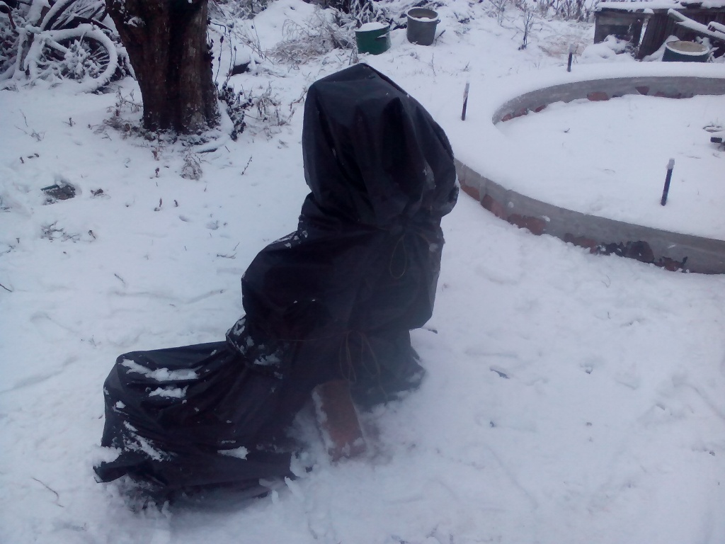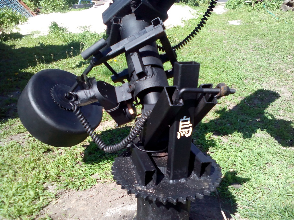10. Теперь почти все… В эту «дикую игрушку» вложил предостаточно своего времени и любви, мне кажется, она заслуживает на собственное имя. В душе, я именовал ее просто «Гадкий утенок». И вправду, на самом деле вышло далеко не идеально, но в начале эксперимента были все шансы зато, что я вообще не смогу его довести до конца, в силу многих технологических трудностей, природной криворукости и неряшливости. Однако получилось чуточку лучше чем ожидал, по этому гадким называть не хотелось. Ответ появился сам собой. Дело в том, что за неимением нормального укрытия (оно в данный момент в разработке), я укутываю монтировку от дождя и снега черной целлофановой пленкой. Однажды после обильного снегопада, она напомнила моей дочери силуэт огромной черной вороны сидящей во дворе. Так и быть, существует в мире «Белый лебедь», пусть же этот механизм нескромно наречется «Черным вороном»… 11. По весне старательно обработал монтировку черной краской с баллончика. Места каллиграфично выводить «Black Raven» не хватило ровных поверхностей, да и почерка. По этому обманул судьбу используя иероглиф. Так и не разобрался китайский он или японский. Но для японца «Черный ворон» - тавтология равносильная нашему «белоснежный снег». В Японии все вороны черные как вороново крыло. По этому, ограничился одним символом «烏».