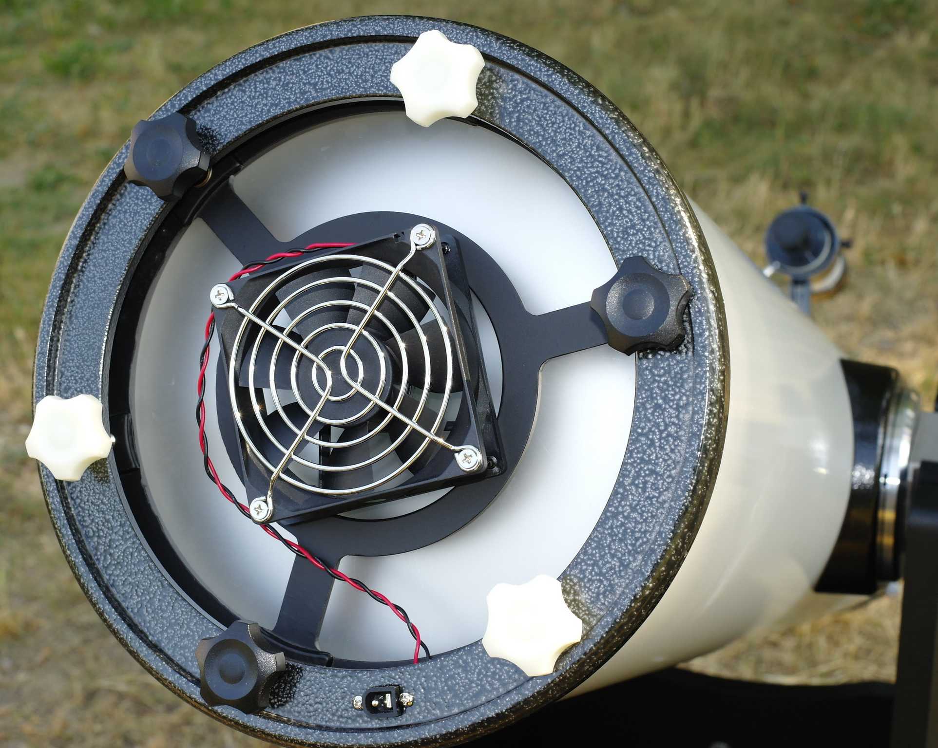 Следующим отличием от трубы Sky-Watcher является наличие охлаждающего вентилятора. Он предназначен для обдува задней части главного зеркала с целью его скорейшей термостабилизации перед началом наблюдений. Электрический контакт вентилятора установлен у края заднего фланца трубы. Для электропитания вентилятора в комплекте телескопа имеется батарейный блок на 8 элементов типа АА.