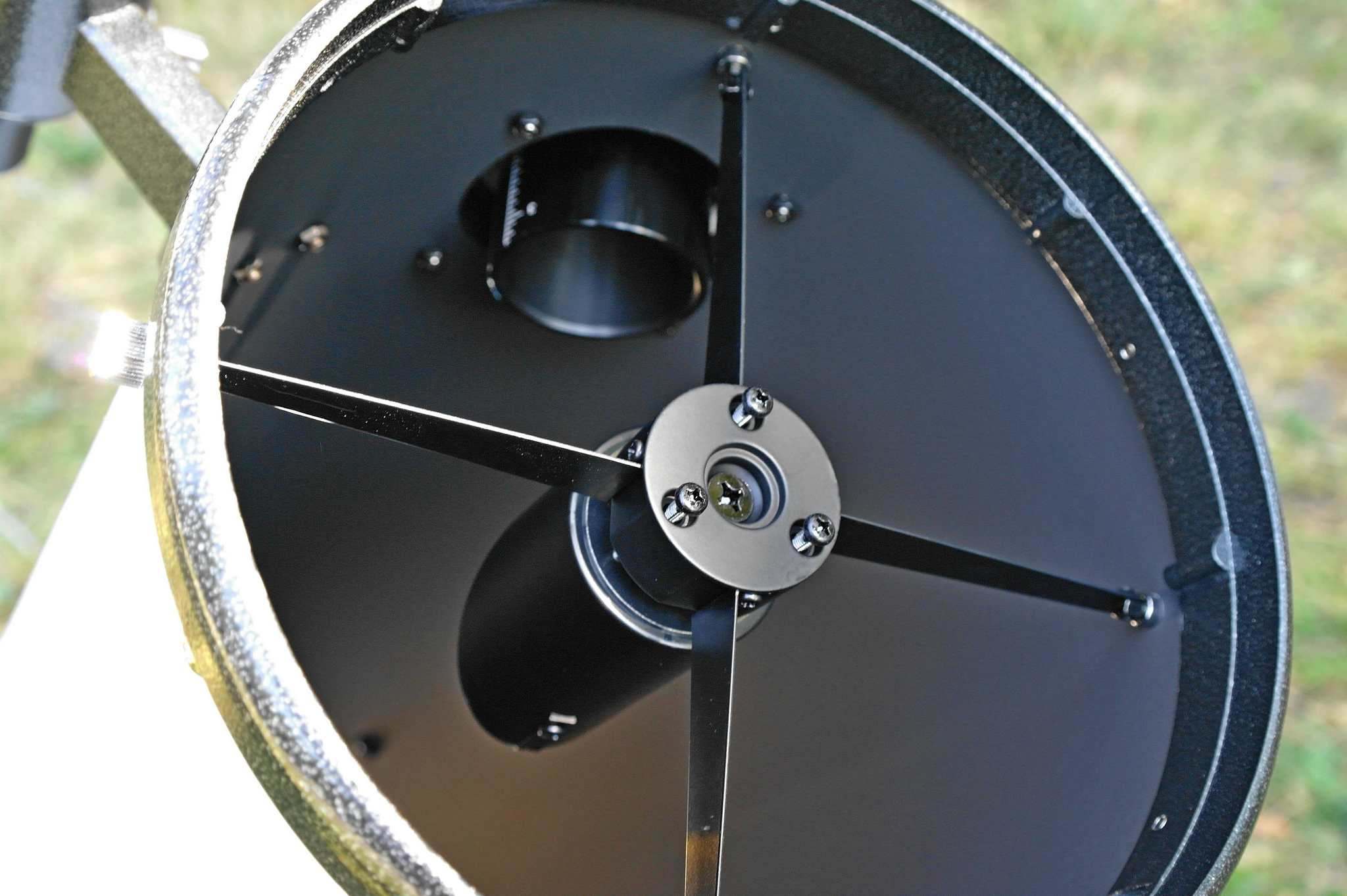 В передней части трубы установлено диагональное зеркало в оправе, закреплённой на четырёх тонких (1,2 мм) растяжках. Оправа вторичного зеркала имеет три юстировочных винта и один стопорный.