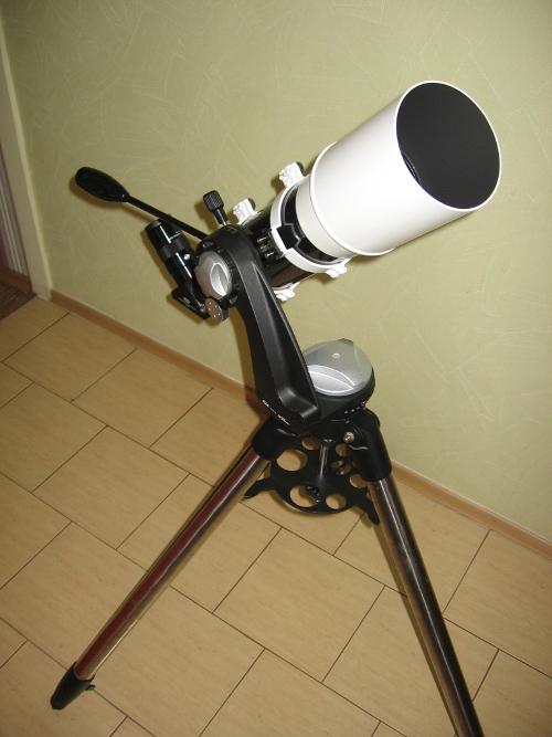 Общий вид монтировки с рефратором SW 150/750. Вес телескопа около 8-ми кг. Не смотря на довольно большой вес телескопа (больше, чем рекомендовано производителем для данной монтировки) все работает нормально, не возникает дискомфорт при наблюдениях даже на средних увеличениях.  Просмотров: 6513