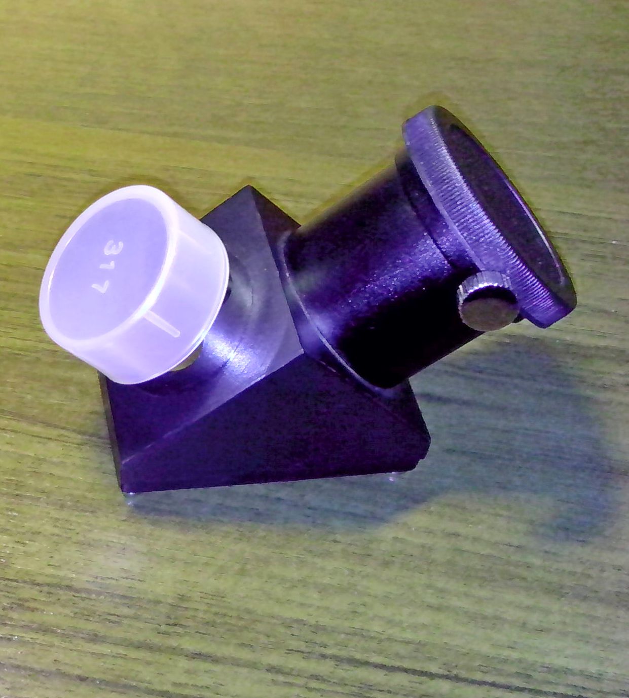 Призма комплектуется полиэтиленовой полупрозрачной крышкой на посадочную втулку и крышкой из черной пластмассы на окулярную втулку. Корпус призмы имеет форму прямоугольного треугольника и изготовлен из черной пластмассы. Нижнее основание - пластмассовая пластина, прикрепленная четырьмя винтиками с выпуклыми головками под крестообразную отвертку. Для фиксации окуляров в окулярной втулке служит 2 никелированных винта М3 с головкой и прямой накаткой. Эта диагональ строит зеркальное изображение. Качество изображения после этой диагонали было протестировано мною в телескоп Celestron AstroMaster 90 AZ при увеличении 154х (окуляр DS Plano 6,5 мм) по яркой звезде. Дифракционная структура изображения звезды правильной формы (без искажений). Светорассеивание несущественное. Светопропускание хорошее, цветовой тон изображения нейтральный. Картинка чище и прозрачнее, чем с призмой. При наблюдении планет – Юпитер, Сатурн уровень детализации хороший. Отличная диагональ. Она выглядит достаточно аккуратно и может быть использована почти во всех астрономических и наземных целях, с поправкой на зеркальное изображение.