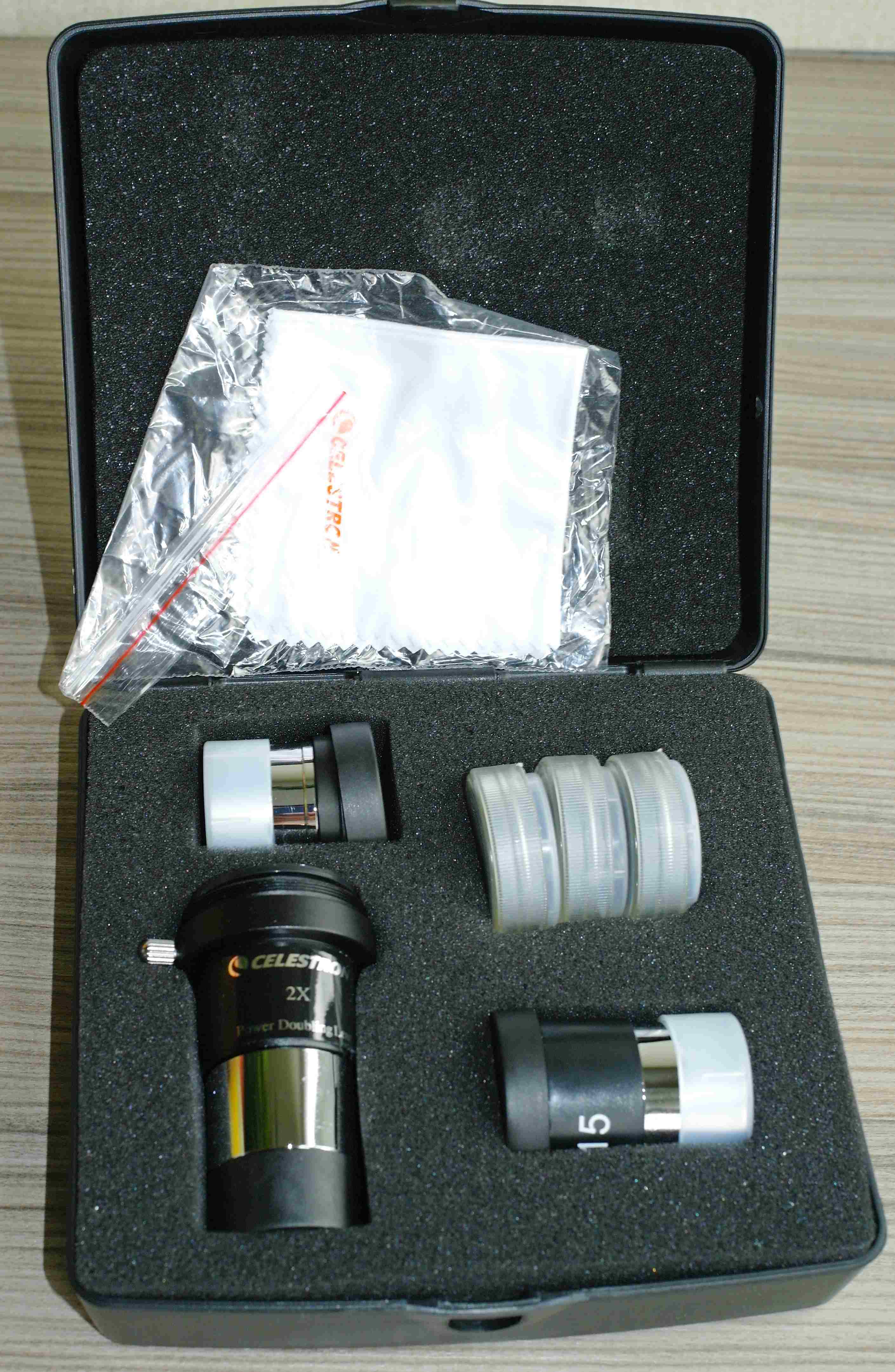 2. Обзор набора окуляров и фильтров Celestron для телескопов Astromaster, 1.25".Данный набор отличается от предыдущего наличием дополнительно ахроматической линзы Барлоу 2-x с T-адаптером для присоединения зеркального или системного фотоаппарата.