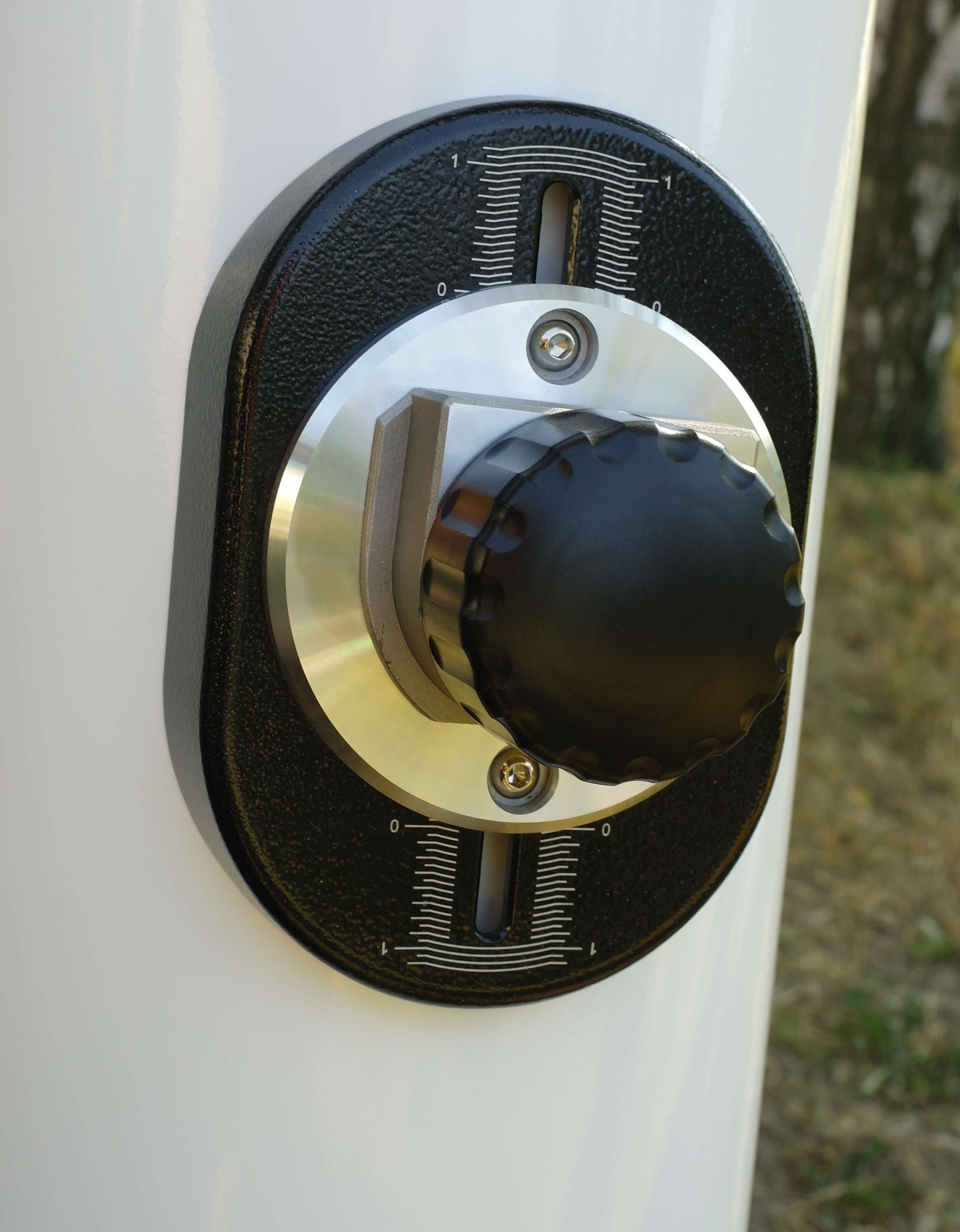 Переходим к фокусеру. В этом телескопе установлен очень совершенный 2-х скоростной фокусер Крейфорда, обладающий высокой чувствительностью и лишенный каких-либо люфтов. Полный диапазон его фокусировки составляет 35 мм. Опция микрофокусировки оказалась весьма полезной. Ручка микрофокусера (черная ручка меньшего диаметра) позволяет в 10 раз увеличить чувствительность фокусировщика. Один полный оборот ручки микрофокусера соответствует 1/10 от оборота большой. Это позволяет комфортно и очень точно настроить фокус. Во время наблюдений, я получал истинное наслаждение легко и непринужденно настраивая фокус, едва касаясь ручки микрофокусера мизинцем.