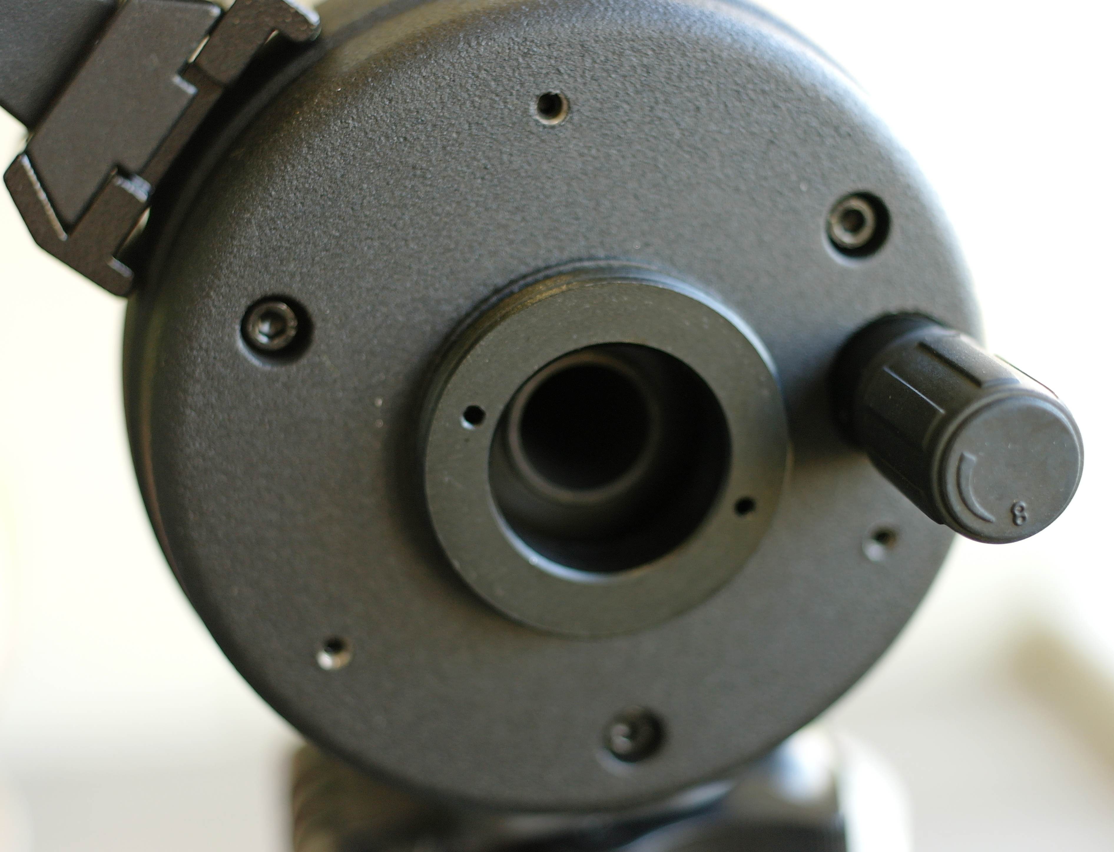Световой диаметр мениска 90 мм. Поверхность стекла покрыта мультислойным просветлением зеленоватого цвета. Защита от паразитных бликов Celestron C90 Mak выполнена хорошо, вокруг вторичного зеркала имеется внутренняя бленда и традиционная "морковка" вокруг отверстия в главном зеркале. Внутренняя часть трубы качественно окрашена черной матовой эмалью.
