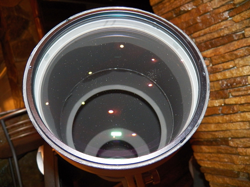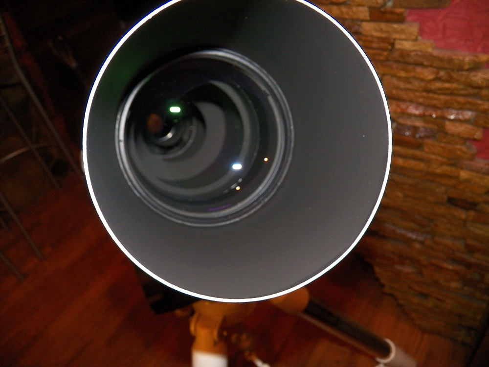 Комплектный искатель был прямой 9\50 но для удобства был заменён на 8\50 с изломом 90 градусов для удобного поиска объектов,,диагональ была двухдюймовой от SW которая была заменена на другую более удобную с компресионными кольцами /хотя родная была не хуже\ по качеству, чем новая. Для удобства переноски самой дудки была изготовлена ручка, которая закреплена к кольцам. Действительно очень удобно. Вид объектива.  Просмотров: 6765