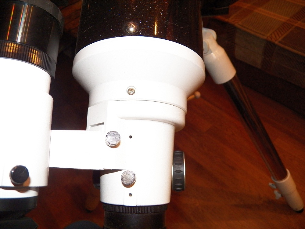 Чернение внутри трубы хорошее, хотя и заметны неоднородности. Просветление объектива точно не однослойное. В косом свете просматривается несколько цветовых оттенков. Бленда съемная. Фото фокусера.  Просмотров: 6765
