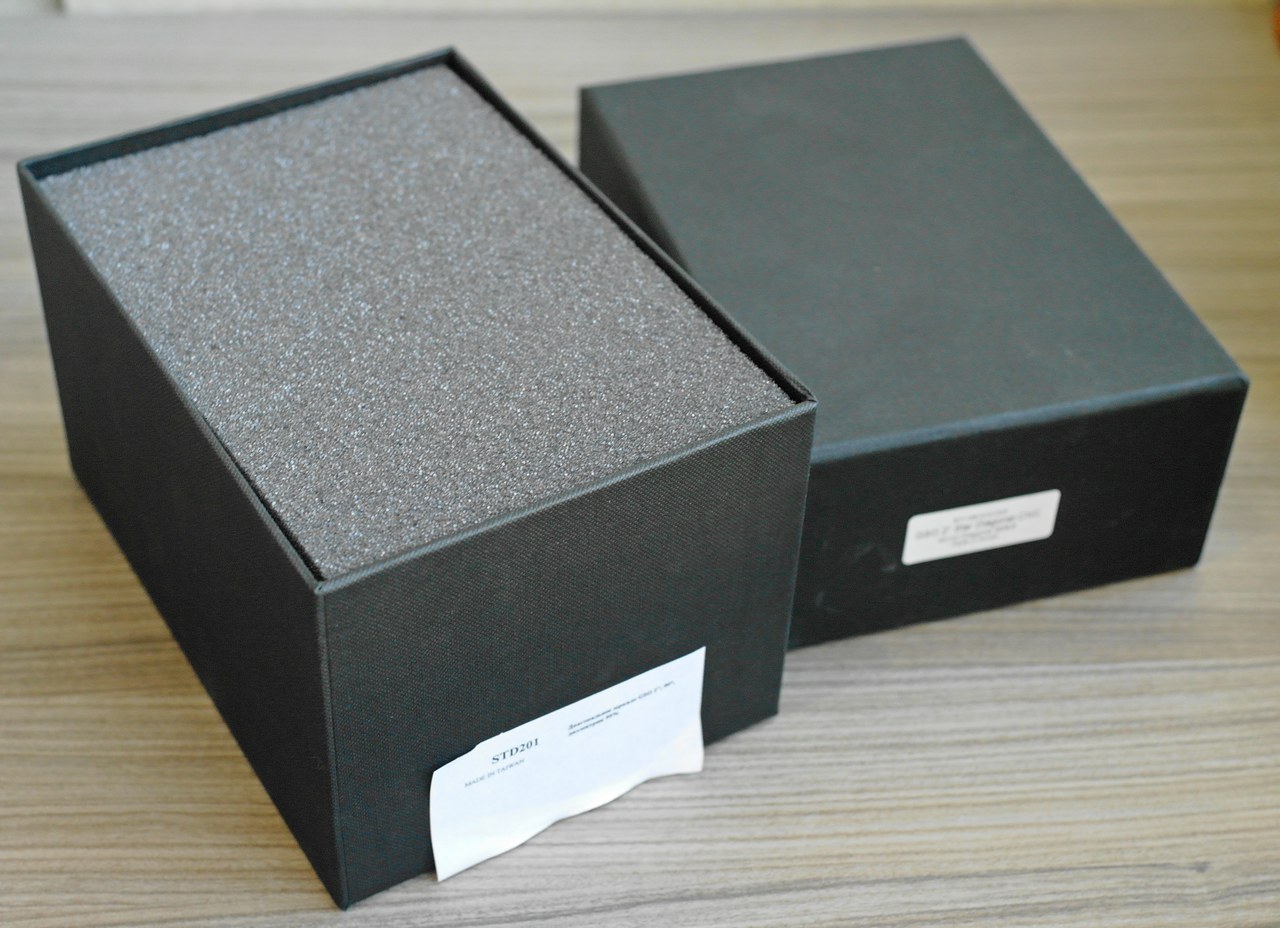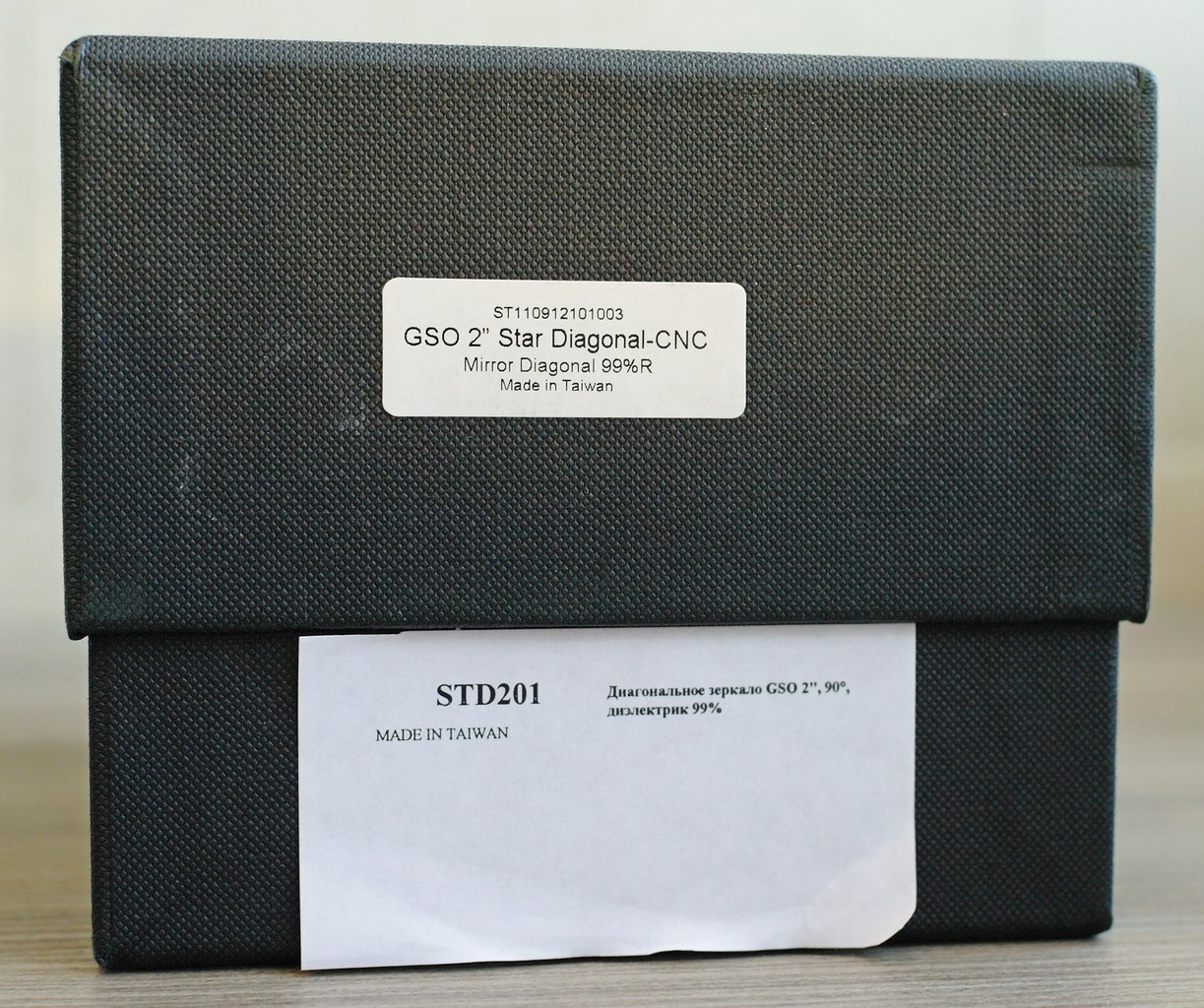 По получении диагональное зеркало GSO 90°, 2”, Dielectric упаковано в очень солидную коробку из черного жесткого рифленого ромбиком картона размером 170х120х100 мм с двумя стикерами на английском и русском языках.