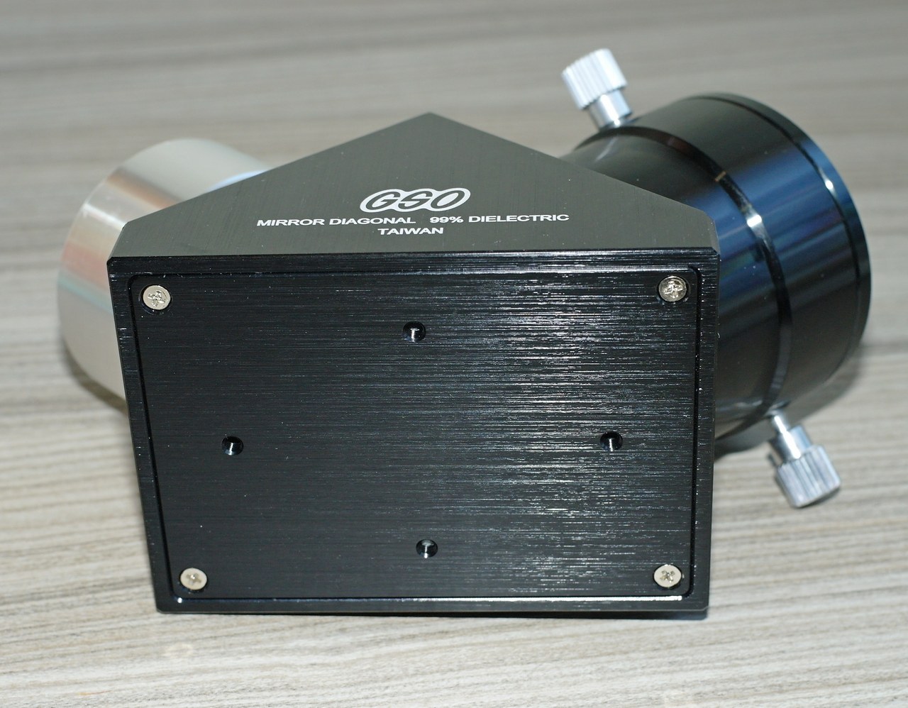 Задняя крышка крепится по углам к корпусу четырьмя винтами со шлицем под крестообразную отвертку. В крышке есть еще четыре резьбовых отверстия, очевидно для юстировки. На корпусе белой краской нанесена надпись GSO MIRROR DIAGONAL 99% DIELECTRIC TAIWAN".