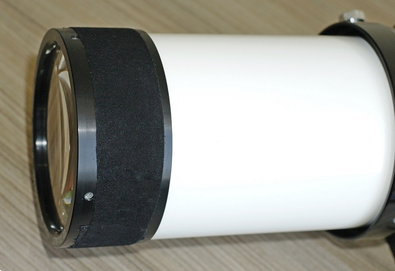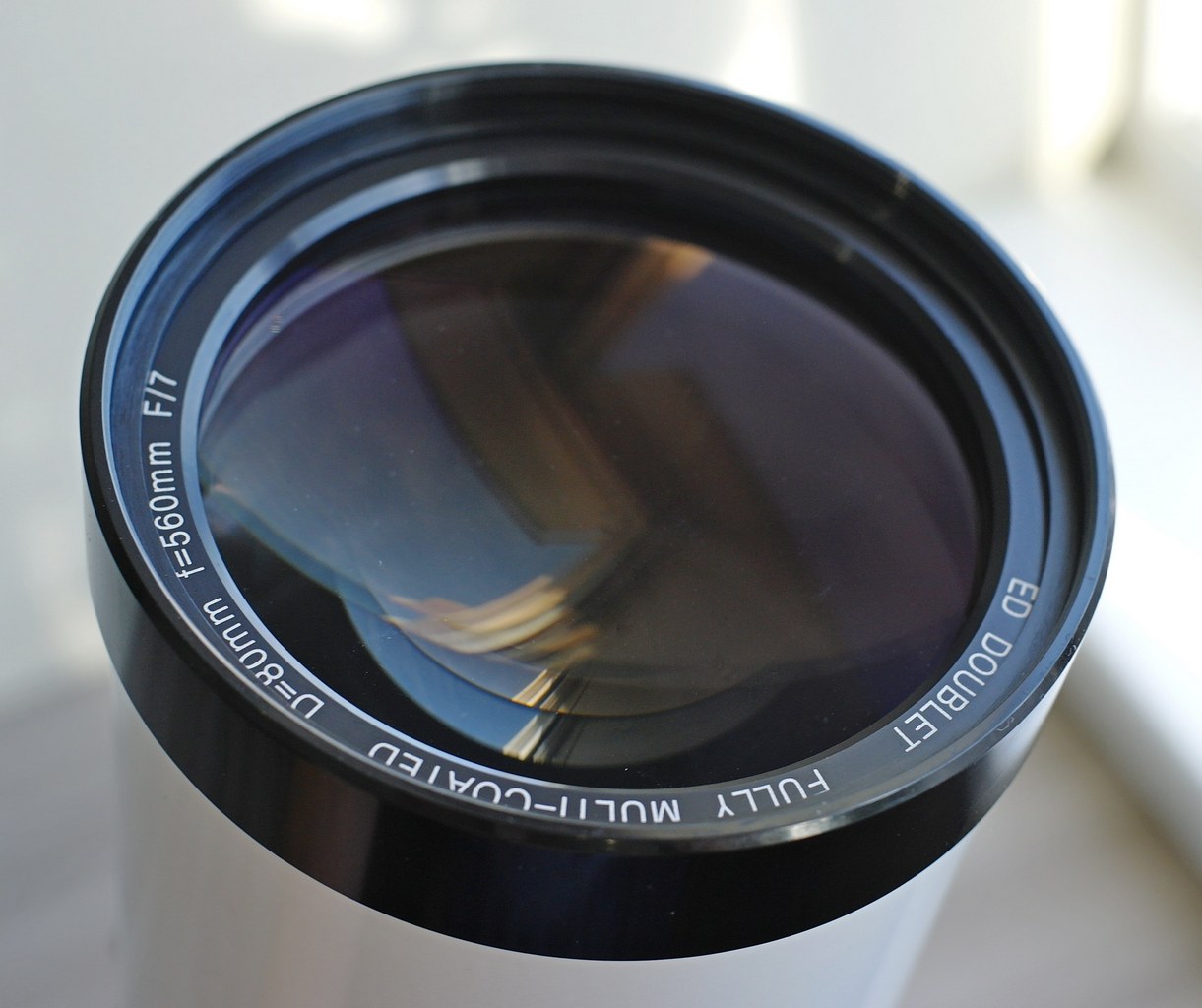 Объектив телескопа состоит из двух линз с очень тонким воздушным промежутком. Первая по ходу света линза положительная из ED стекла. На линзы объектива нанесено многослойное просветляющее покрытие. Блики неяркие, приглушенные. Наружные поверхности линз имеют зеленоватый цвет, внутренние голубовато-зеленый. Торцы линз зачернены. При снятой бленде-противоросснике на оправе можно увидеть юстировочные винты объектива. Их четыре пары и большая часть из них заклеена полосой из черного фетра, служащей для уплотнения положения бленды относительно трубы. При необходимости эту полоску не сложно отклеить для выполнения юстировки и затем приклеить на прежнее место.