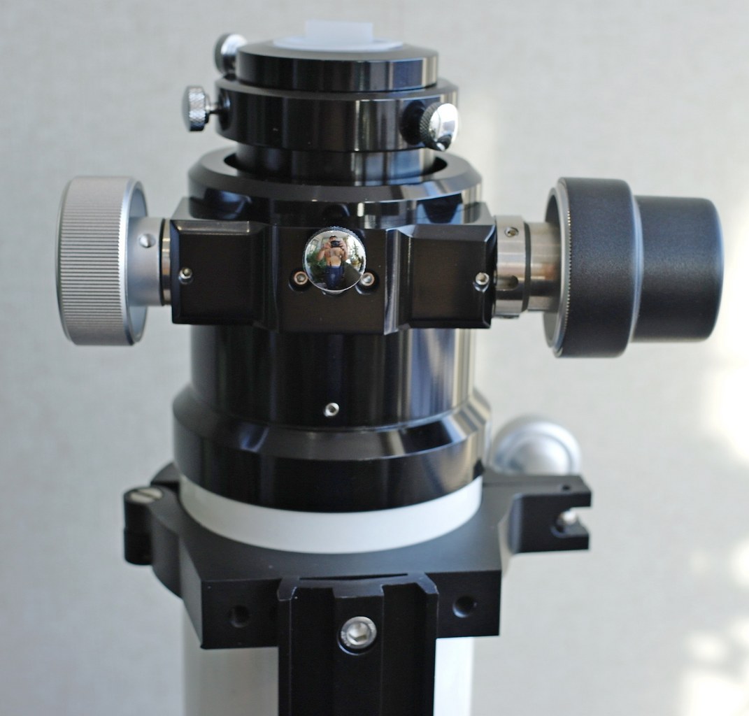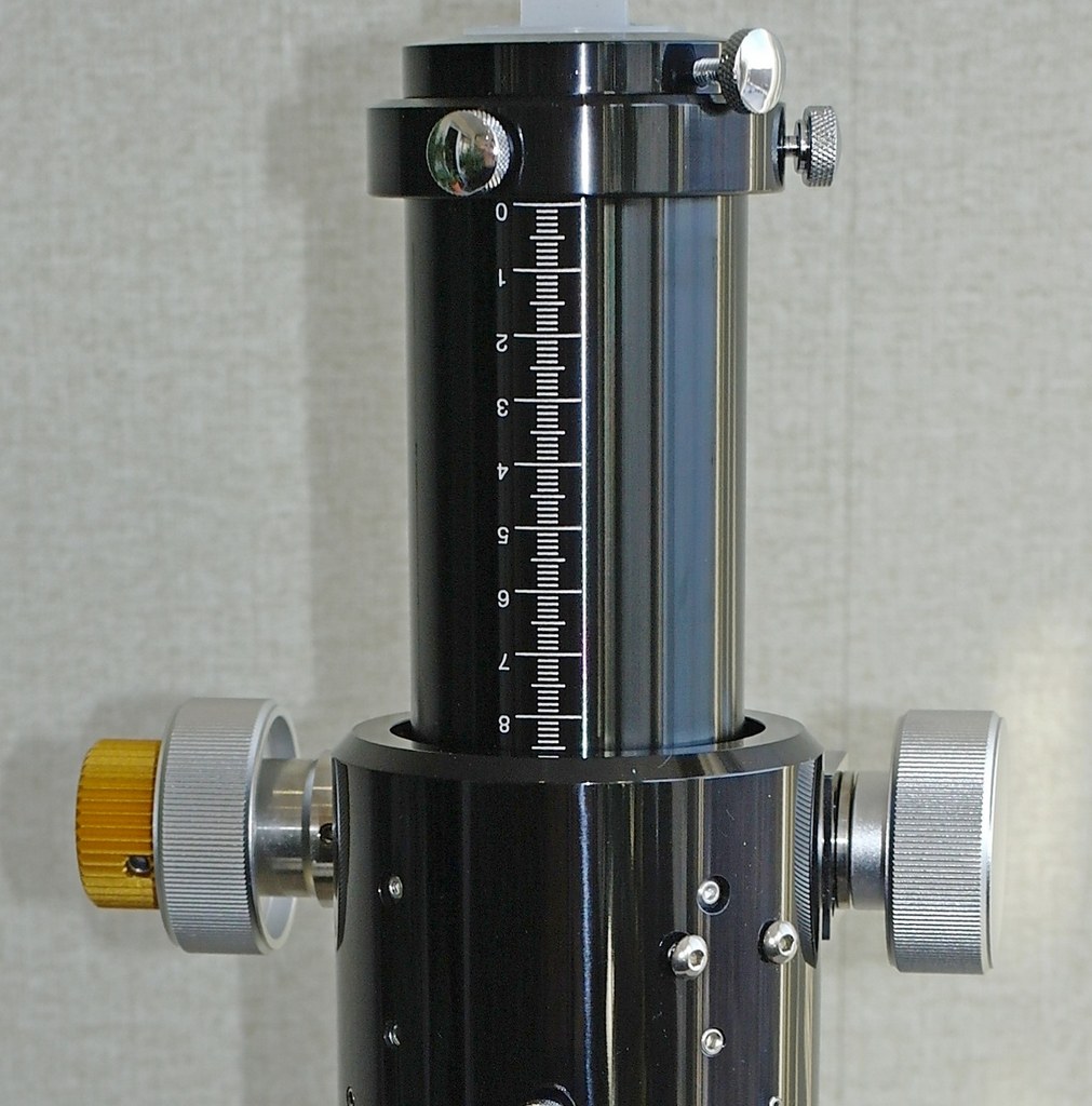 Фокусер телескопа – отдельная тема. Это высокоточный, поворотный двухскоростной (1:10) фокусер Крейфорда. Снаружи он окрашен блестящей черной эмалью и имеет мерную шкалу длиной 86 мм, с ценой деления в 1 мм. Фокусер 2’’ формата, но имеет также адаптер на 1,25” с фиксацией аксессуаров компрессионными кольцами из латуни.