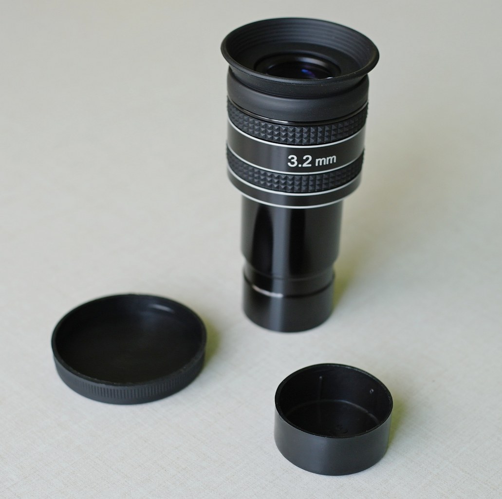 В этот раз решил измерить и Парфокальность, благо на фокусере ED рефрактора есть миллиметровая шкала. ХарактеристикиХарактеристика Значение Фокусное расстояние, мм 3,2 Длина с выдвинутым наглазником, мм 112 Длина с задвинутым наглазником, мм 97 Длина посадочной втулки, мм 24 Вынос вых. зрачка от стекла глазной линзы, мм 15 Вынос вых. зрачка от края наглазника, мм 6 Диаметр корпуса (max), мм 39,5 Диаметр посадочной втулки, мм 31,65 Диаметр проточки, мм 30,7 Диаметр глазной линзы, мм 20,5 Диаметр полевой линзы, мм 5 Парфокальность, мм 0 Световой диаметр полевой диафрагмы, мм 3,3 Расчетное поле зрения, градусы 59 Высота наглазника, мм 7 Диаметр края наглазника, мм 47 Масса, грамм 149ТестированиеТестирование производилось по яркой звезде (Процион), Юпитеру и Луне в ED рефракторе 1:7 и телескопе Ньютона 1:5. Оценка величины и типа аберраций, вносимых окуляром в построенное телескопами изображение, показала очень небольшую величину собственных аберраций окуляра (даже при относительном отверстии 1:5). Заметные глазом искажения (астигматизм и кривизна поля) проявляются только у самого края. При дрейфе яркой звезды через поле зрения окуляре в ED рефракторе идеальный кружок Эйри немного исказился у самого края поля зрения. Тоже и с диском Юпитера, изображение едва заметно испортилось только у самого края. Для Луны вообще отличный окуляр! В оба телескопа качество изображения без замечаний. Светорассеивание умеренное. Бликования не заметил. Выводы и рекомендацииОкуляр мне понравился. Я решил пополнить им мою коллекцию окуляров.Он будет очень хорош по двойным звездам и для тонкого исследования оптики телескопа. Хорошо справляется с ролью обзорного для изучения дисков Луны и Солнца. Можно использовать для достижения предельных увеличений телескопа для наблюдения дисков планет, хотя при этом надо учитывать, что на таких увеличениях заметно проявление дифракции и контраст изображения падает, хотя причина большей частью в телескопе, чем в окуляре. В целом окуляр заслужил положительную оценку. По уровню коррекции полевых аберраций, пожалуй лучший в линейке.
