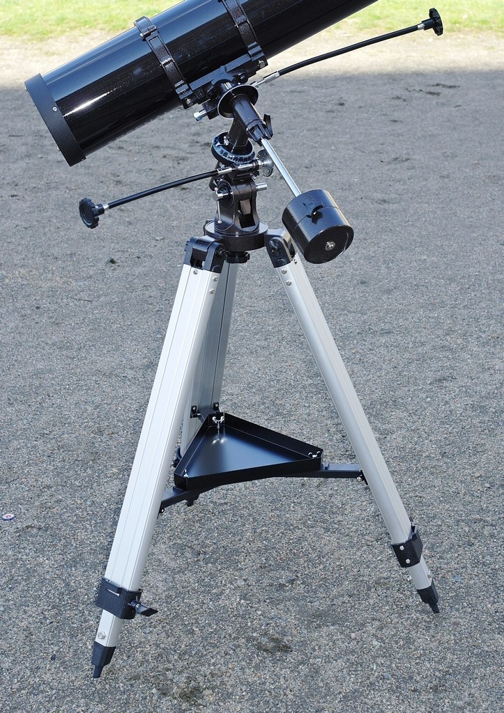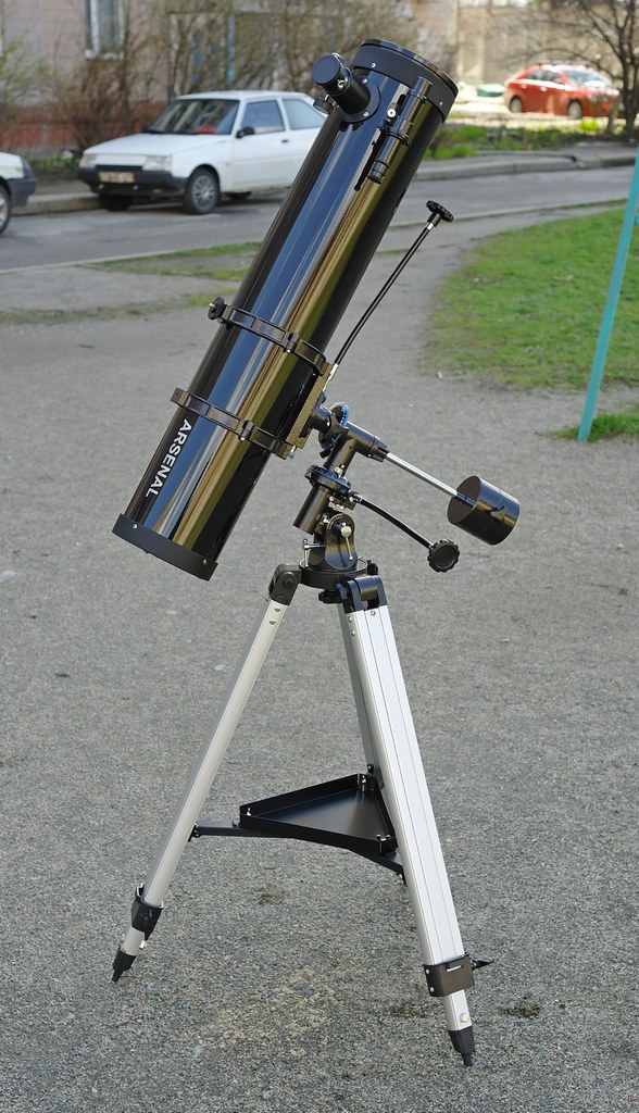 Монтировка Монтировка экваториальная, немецкого типа - EQ2 на алюминиевых ногах. Голова монтировки качественно окрашена черной молотковой эмалью. В нижней части монтировки поверх растяжек, соединяющих ноги монтировки, устанавливается металлическая площадка для аксессуаров. Она придает монтировке дополнительную жесткость. По обеим осям установлены координатные круги и имеется возможность установки часового электропривода, что позволяет заняться начальным астрофото и не отвлекаться для ведения телескопа во время наблюдений. Монтировка в целом справляется с весом трубы, но на больших увеличениях вибрации довольно велики и усложняют процесс фокусировки.