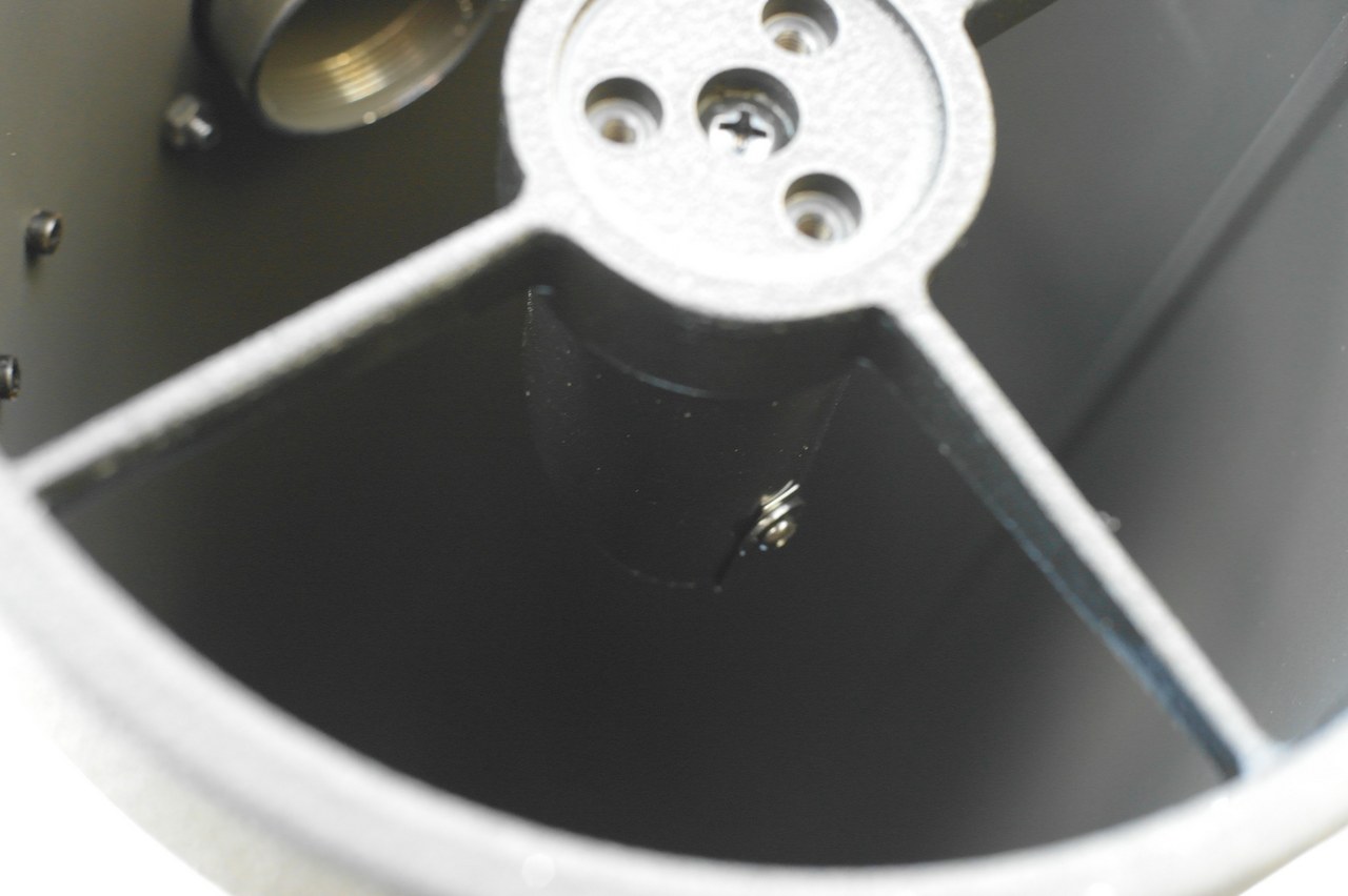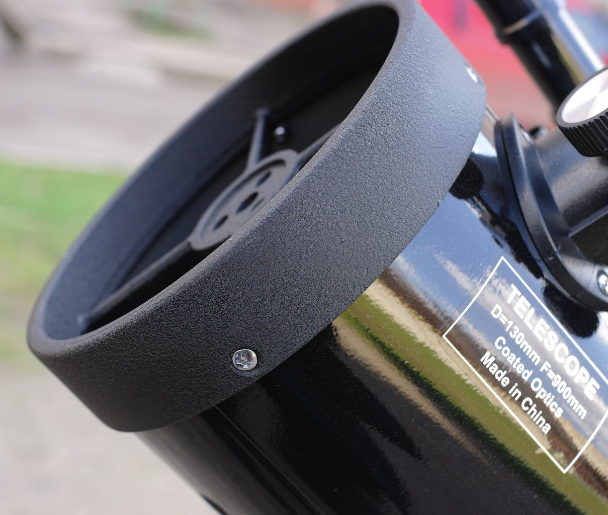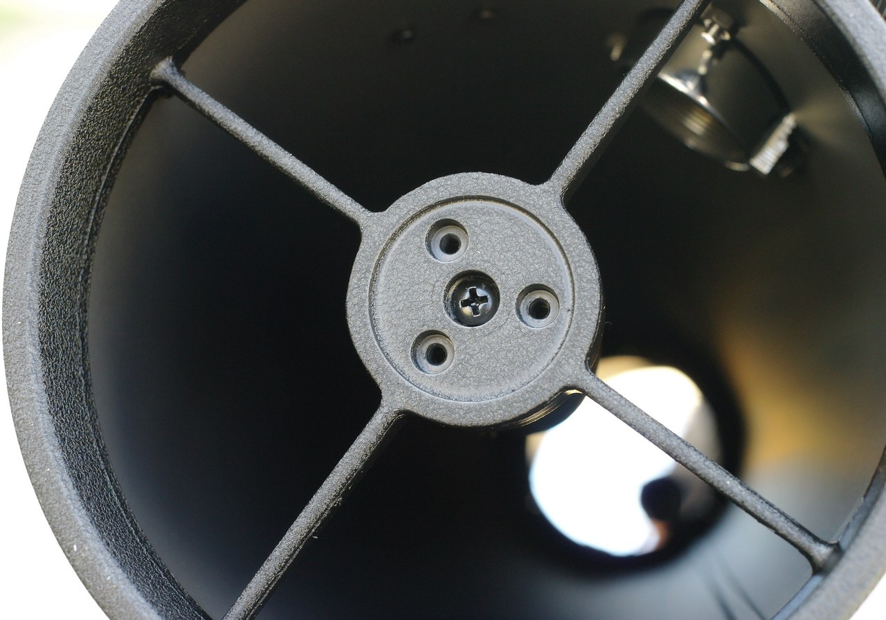 Задний фланец (он же база для оправы главного зеркала) тоже сделан из прочного толстого пластика и крепится к трубе такими же винтами, что и передний фланец. Задняя часть трубы наглухо заделана крышкой, защищающей заднюю часть главного зеркала, что затруднит его быструю термостабилизацию, но с другой стороны и препятствует попаданию пыли внутрь трубы. К нижнему фланцу тремя парами юстировочных винтов крепится подвижная часть оправы главного зеркала. Головки винтов имеют шлицы под крестообразную отвертку. Винты с сильнее выступающей головкой – упорные, служат для фиксации результатов юстировки. Более низкие винты притягивающие, подпружиненные – ими регулируют наклон подвижной части оправы главного зеркала.