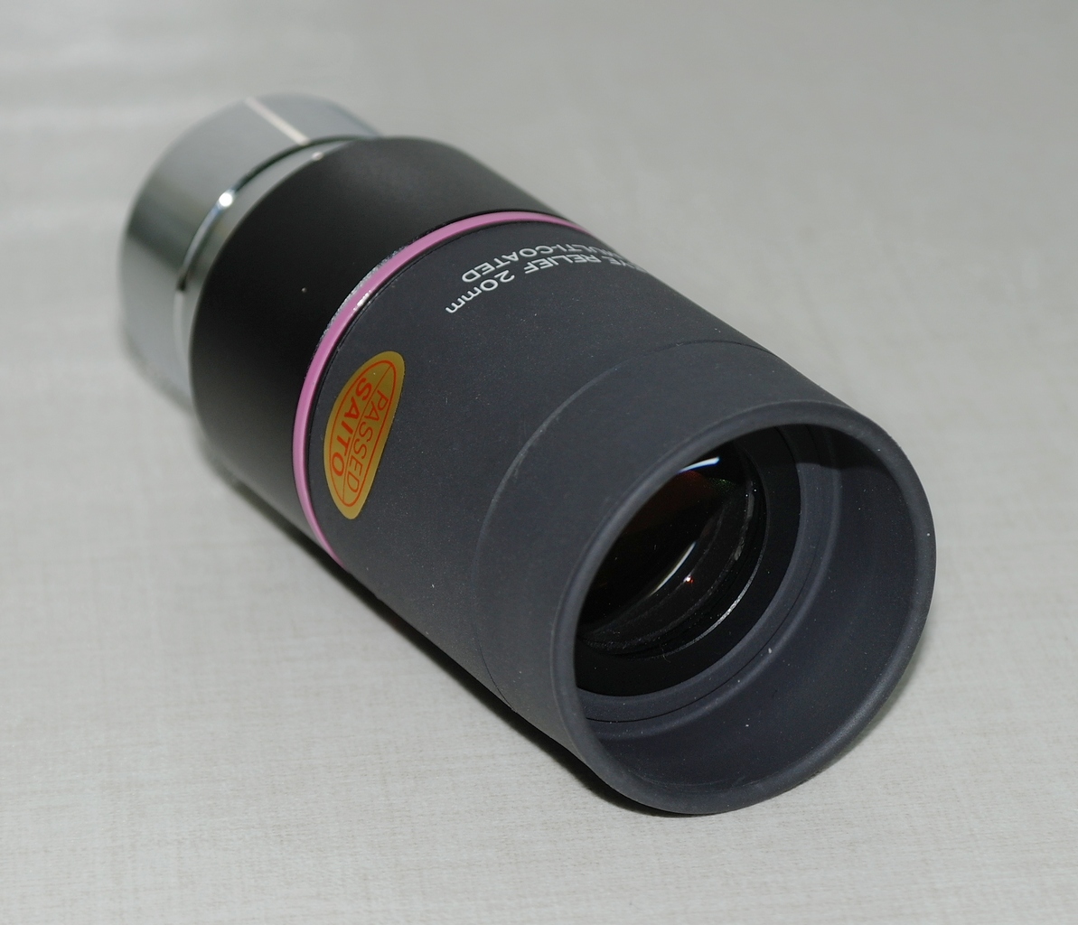 На обрезиненную часть корпуса также наклеен золотистый овальный стикер (клеймо контроля качества) - "Passed/SAITO". Поверхности глазной и полевой линз практически плоские. На посадочной втулке выполнена гравировка “Japan”.
