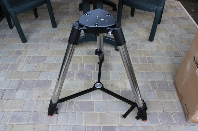 Процедура настройки телескопа достаточна проста. Устанавливаем телескоп по уровню, ослабляем фрикционы, если они были до этого зажаты, разворачиваем руками телескоп передней частью трубы в сторону севера, при этом саму трубу выставляем горизонтально. Зажимаем аккуратно фрикционы. Включаем кнопку питания на монтировке. О том, что телескоп включился, нам скажет светящийся логотип Celestron на монтировке и мигающий индикатор сети WiFi (это означает, что система ожидает подключения). Также включится красная светодиодная подсветка окулярного столика, расположенного на основании монтировки (яркость подсветки индикаторов и столика регулируется в настройках приложения SkyPortal).
