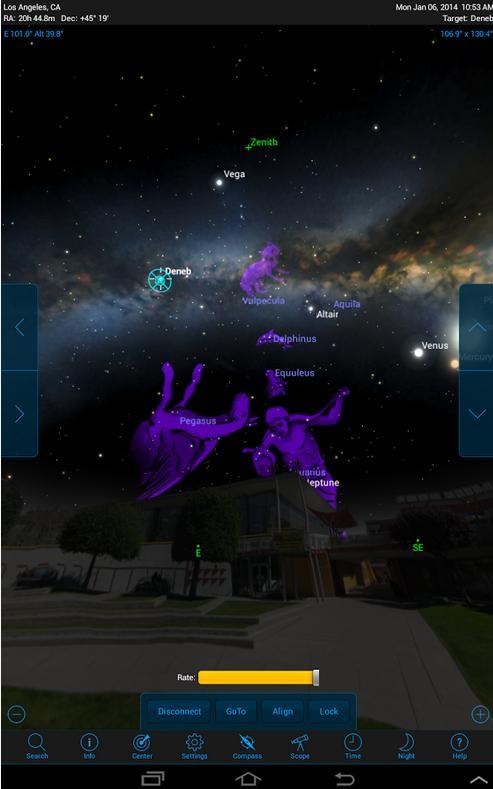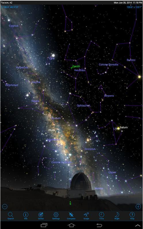 • Режим компаса и распознавания. Позволяет пользователю направить мобильное устройство на ночное небо для мгновенной идентификации небесных объектов.
