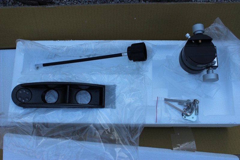 Общий вес монтировки порядка 6,5 кг, при этом она в состоянии нести нагрузку от 6-8 кг. Теперь опишу трубу и ее комплектацию. В коробке с трубой, кроме нее самой, находятся: переходник-экстендер 35 мм, искатель 8х50 со стойкой, кольца для трубы, пластина крепления типа “ласточкин хвост” и винты крепления с шестигранным ключом.  Просмотров: 6216