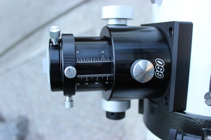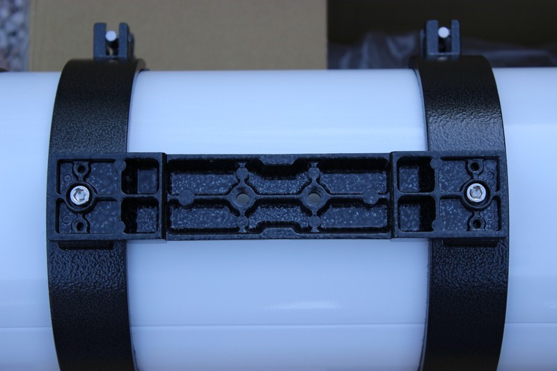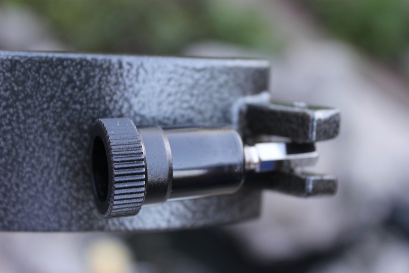 Перед установкой колец вставьте стойку искателя в гнездо и зафиксируйте ее там. Если этого не сделать на данном этапе сборки, установленные кольца не дадут вам это сделать впоследствии. Надо сказать, что комплектный искатель весьма хорош и имеет качественно просветление. При необходимости его окулярная часть легко вывинчивается, а вместо нее может быть установлена камера для гидирования. Это может быть полезно в том случае, если вы захотите использовать данную трубу по ее основному назначению – астрофото.