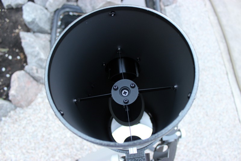 Сама оптическая труба имеет непривычно короткую длину 560 мм . Она металлическая, с обеих концов дополнительную жесткость ей придают специальные кольца. В переднее кольцо на трении устанавливается пластиковая крышка, закрывающая трубу во время хранения и транспортировки. Заднее кольцо является основой для оправы главного зеркала. Внутри труба покрыта качественной черной матовой краской.  Просмотров: 6211