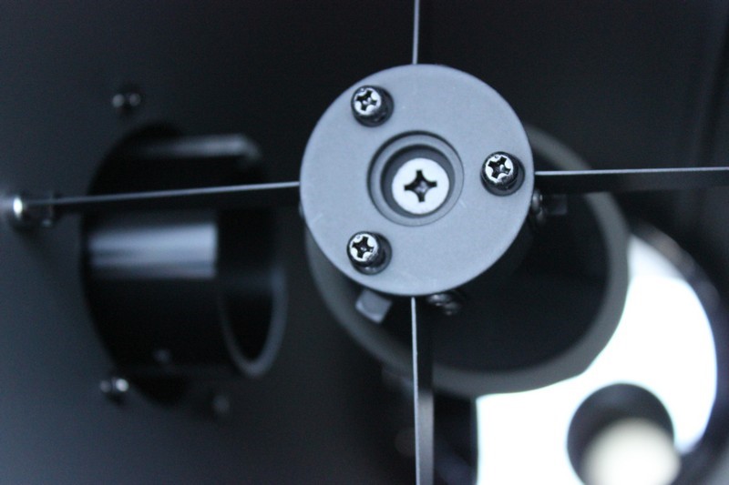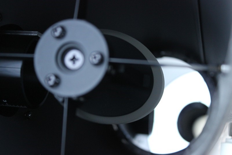 Узел вторичного зеркала крепится к трубе при помощи стальных растяжек толщиной 0,8 мм. Сама же «вторичка» приклеена на профильную литую площадку. Юстировка производится с помощью винтов с крестовой головкой, расположенных на узле крепления вторичного зеркала.  Просмотров: 6211