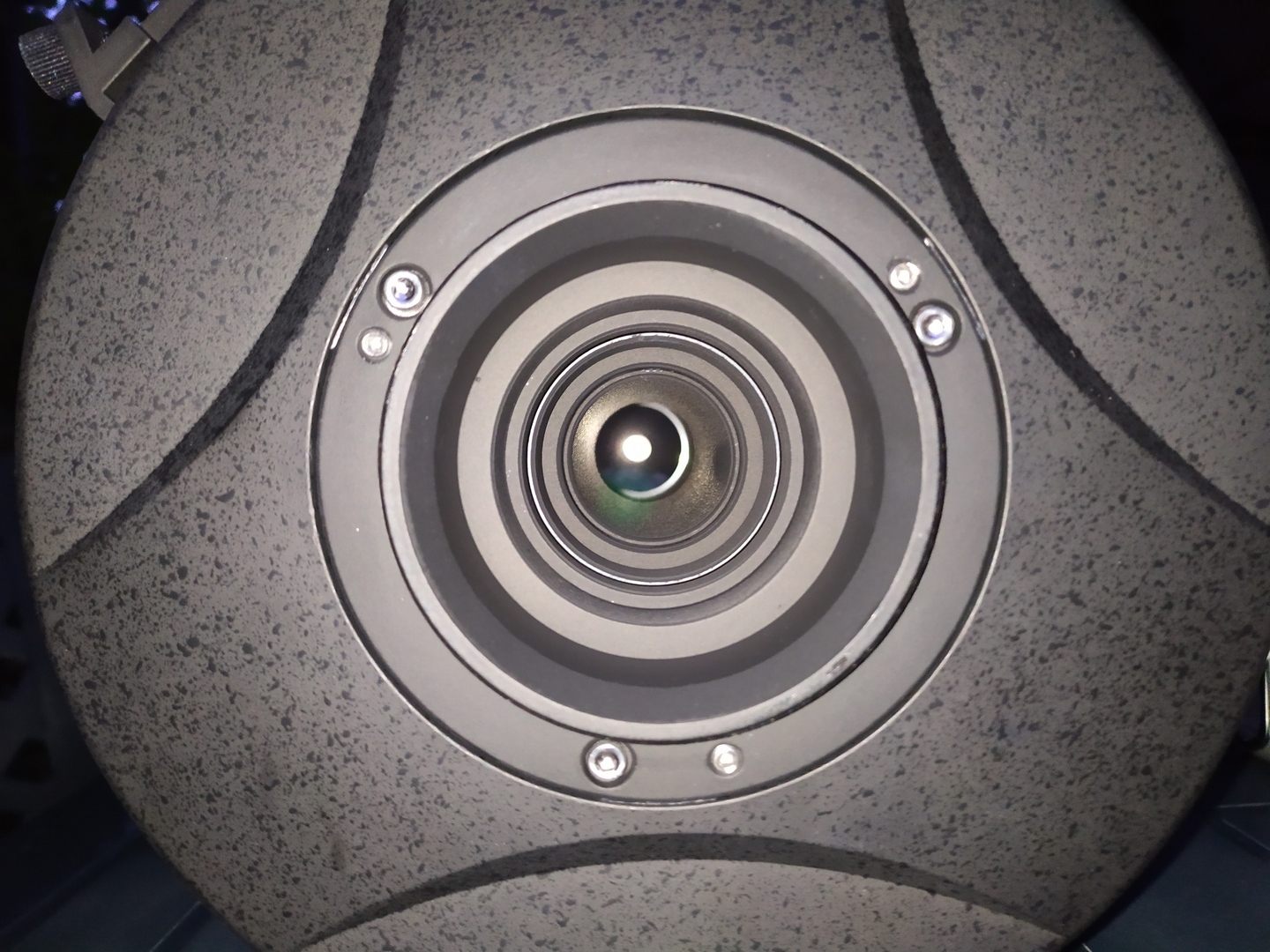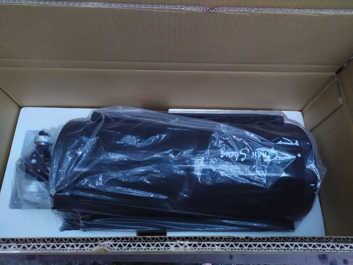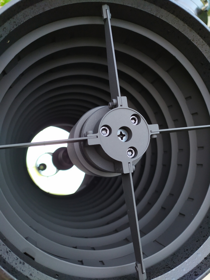Но вернусь к 8-ке. Первое, как обычно, внешнее впечатление. Вес в коробке 12кг, чистый вес без упаковки 7,5 кг. Труба достаточно компактная - 535 мм в длину (без фокусера) и 230 в диаметре. Она очень жесткая, за счет аж одиннадцати диафрагм-отсекателей на внутренней стенке. Эта батарея диафрагм, в сочетании с двумя основными блендами, фактически исключает любую паразитную засветку.