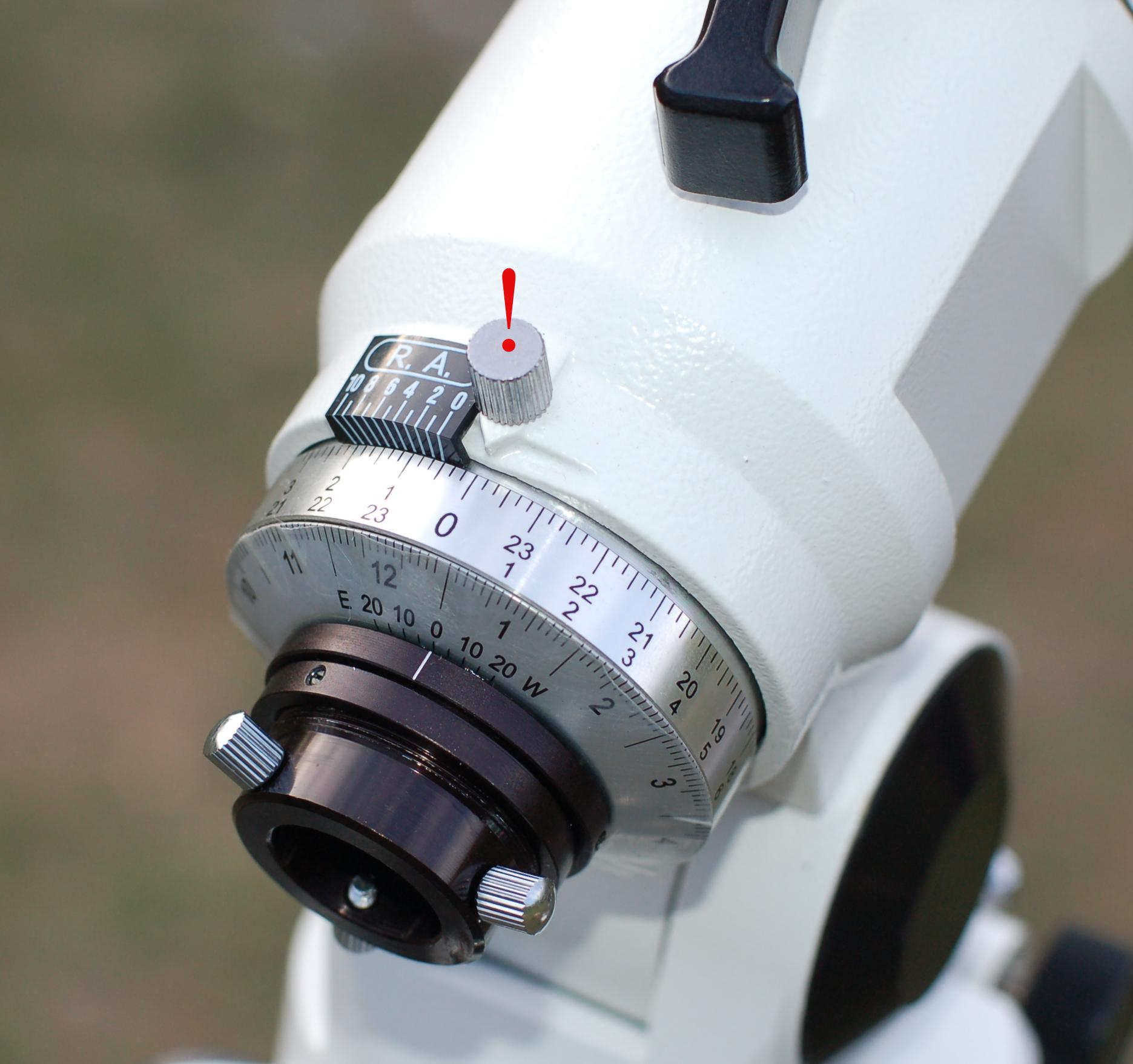 Если отрегулируете зажим указанного винта - то будет вращаться вместе с полярной осью в обоих режимах. Указанный винт регулируется один раз, каждый раз его откручивать не надо. Шкала при этом с небольшим усилием проварачивается вручную для установки показаний часовой оси.