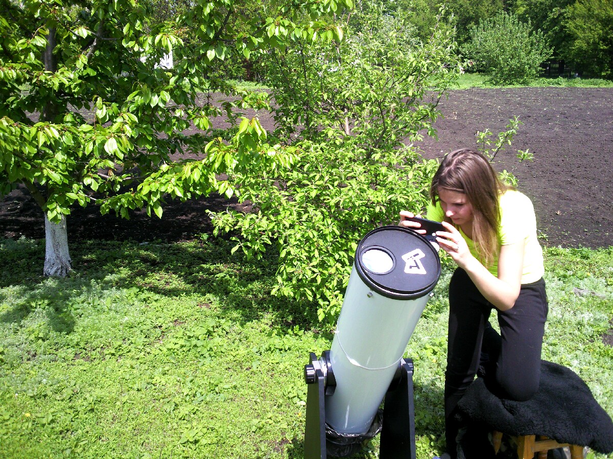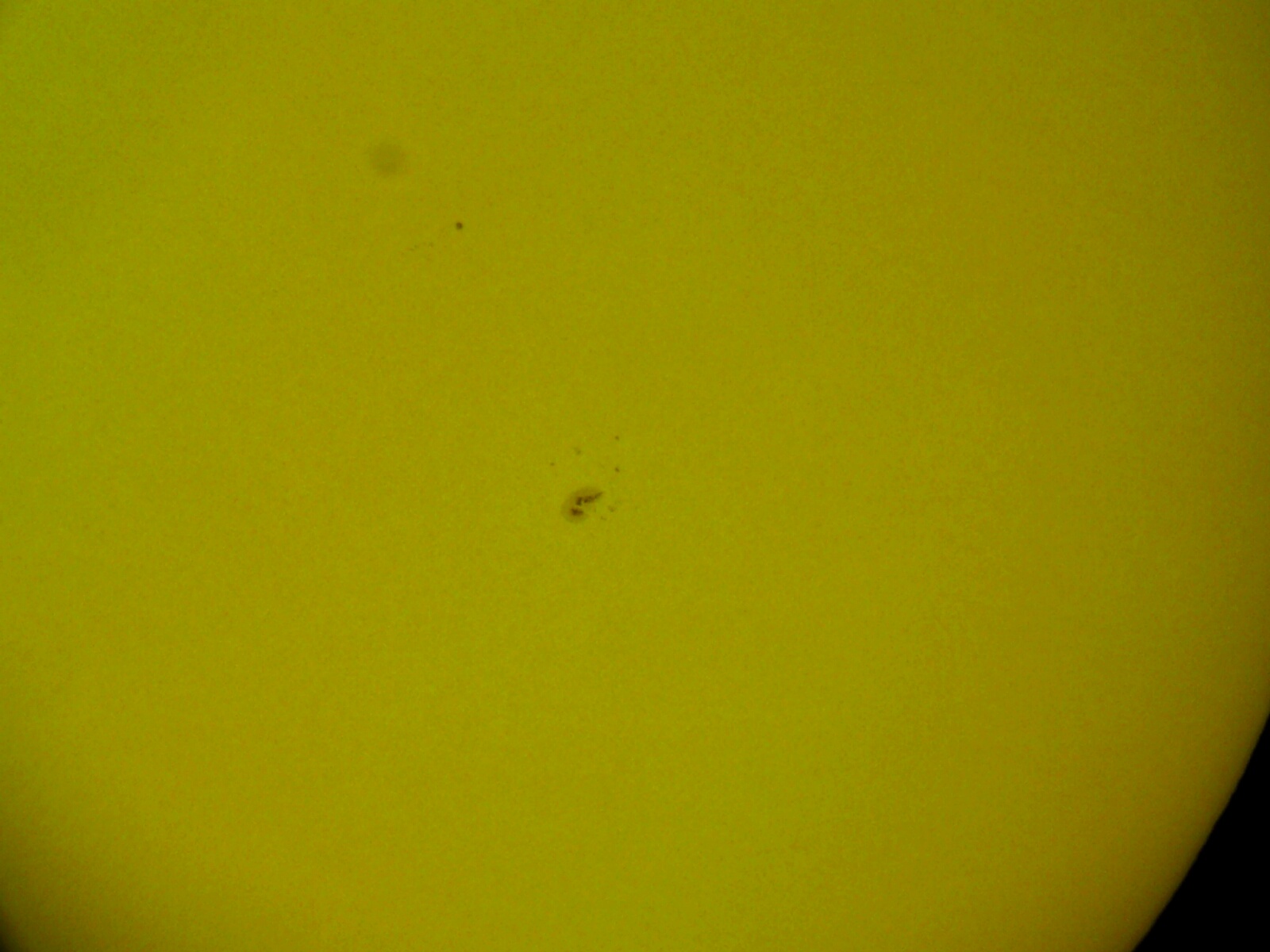 в придверии астрособытия.прохождении Меркурия по диску Солнца решил сегодня испытать свой солнечный фильтр. Успел...до обеда было солнечно,а сейчас лупасит дождь с грозой. Визуально наблюдать очень классно,Солнце сейчас не богатое на пятна. Одно крупное есть и очень много меленьких вокруг него. Грануляцию очень хорошо видно,подробности в большом пятне(перепады яркости и какая то волокнистая структура) Вообщим наблюдать одно удовольствие. Фото получаеться плохо(что сказать...смартфон) использывал 3 штуки,два своих и один дочкин. Слишком ярко,картинку засвечивает,ни наодном не добился положительного результата. На завтра вырежу круг на фильтр,только с меньшим диаметром где то 50 мм,чтобы чуть погасить яркость. Всё же очень надеюсь что завтра будет солнечный день,хоть прогноз и рисует дождь