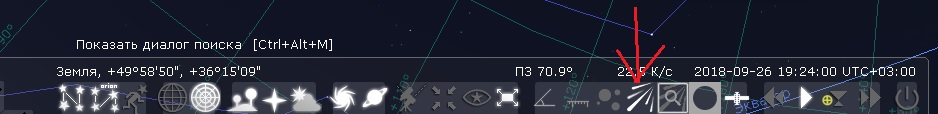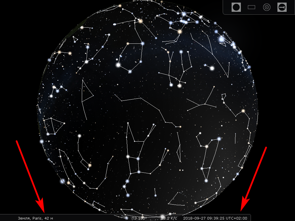 ... остался последний штрих. Когда делаю скриншот из программы, то в область картинки попадает информационная панель с датой, временем, часовым поясом. То есть панель задач внизу программы скрывается не до конца. Использовал проекцию "Ортографическая". С помощью нее получается довольно четкий контур и нет лишних элементов ... но вот, уменьшить размер звездного неба не получается и оно занимает все окно программы.